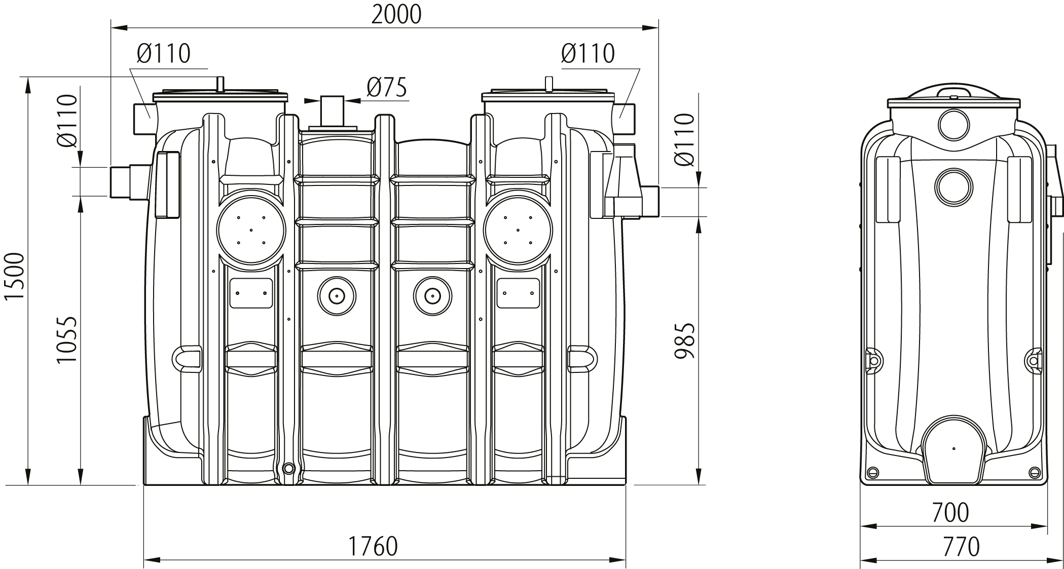 ACO LipuJet P-OD är avsedd för tömning via tömningsrör. Öppningarna, som även är avsedda för inspektion och rengöring, är försedda med lukttäta lock med snabblås.