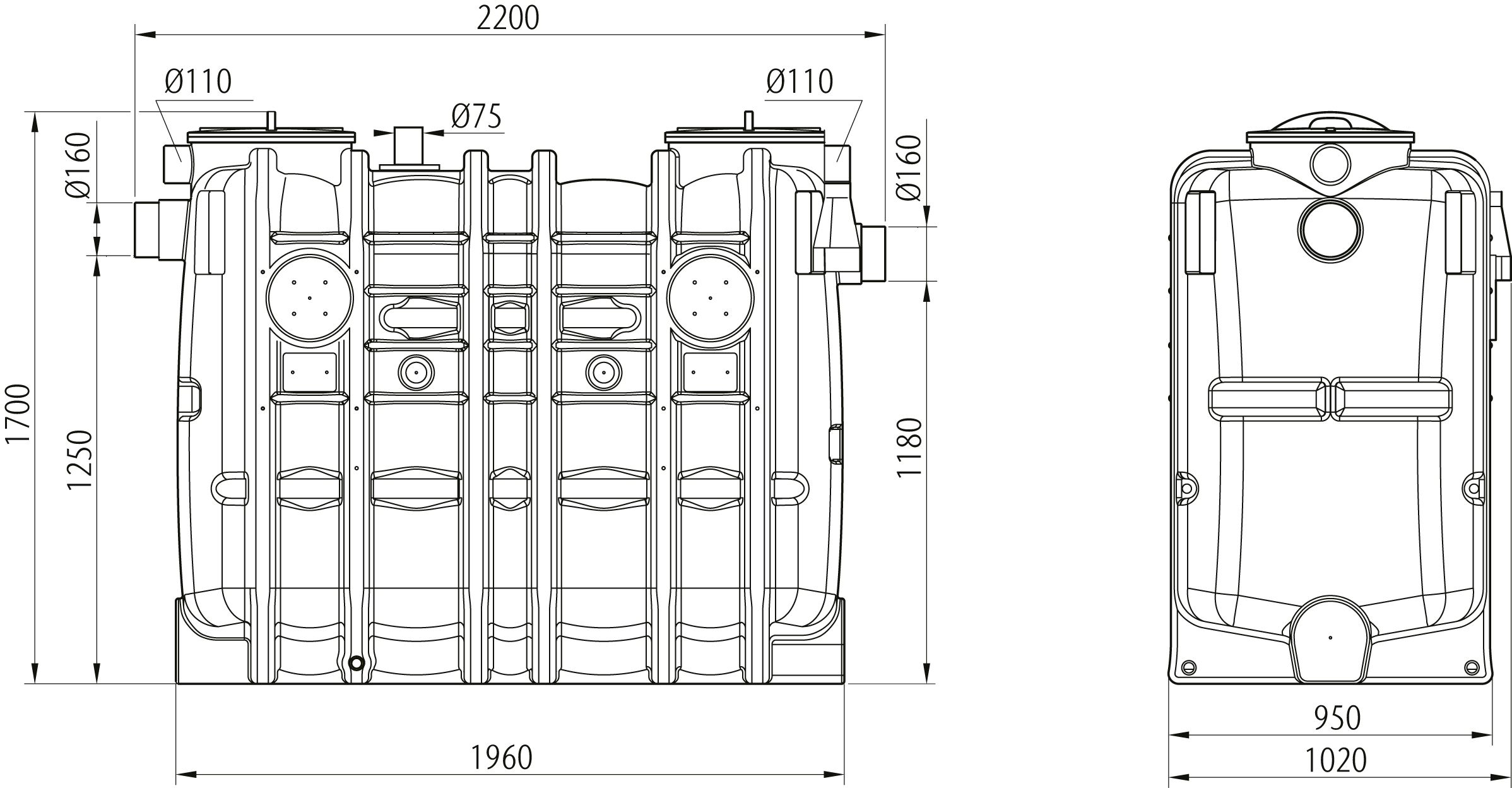 ACO LipuJet P-OD är avsedd för tömning via tömningsrör. Öppningarna, som även är avsedda för inspektion och rengöring, är försedda med lukttäta lock med snabblås.