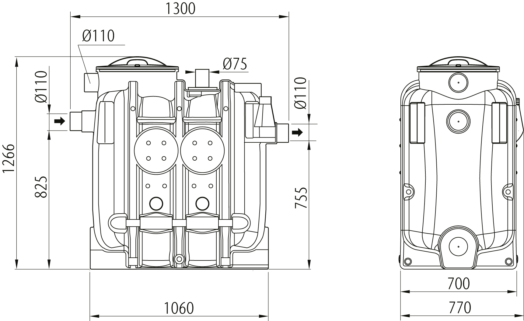 ACO LipuJet P-OD är avsedd för tömning via tömningsrör. Öppningarna, som även är avsedda för inspektion och rengöring, är försedda med lukttäta lock med snabblås.