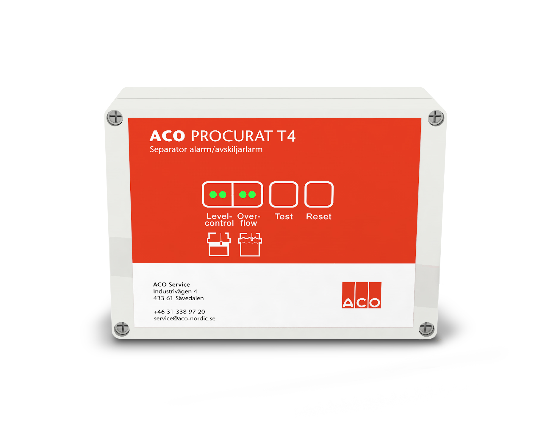 Avskiljarlarm med diodindikation. Ingång för nivå- och dämningsgivare. Centralenheten levereras utan givare.