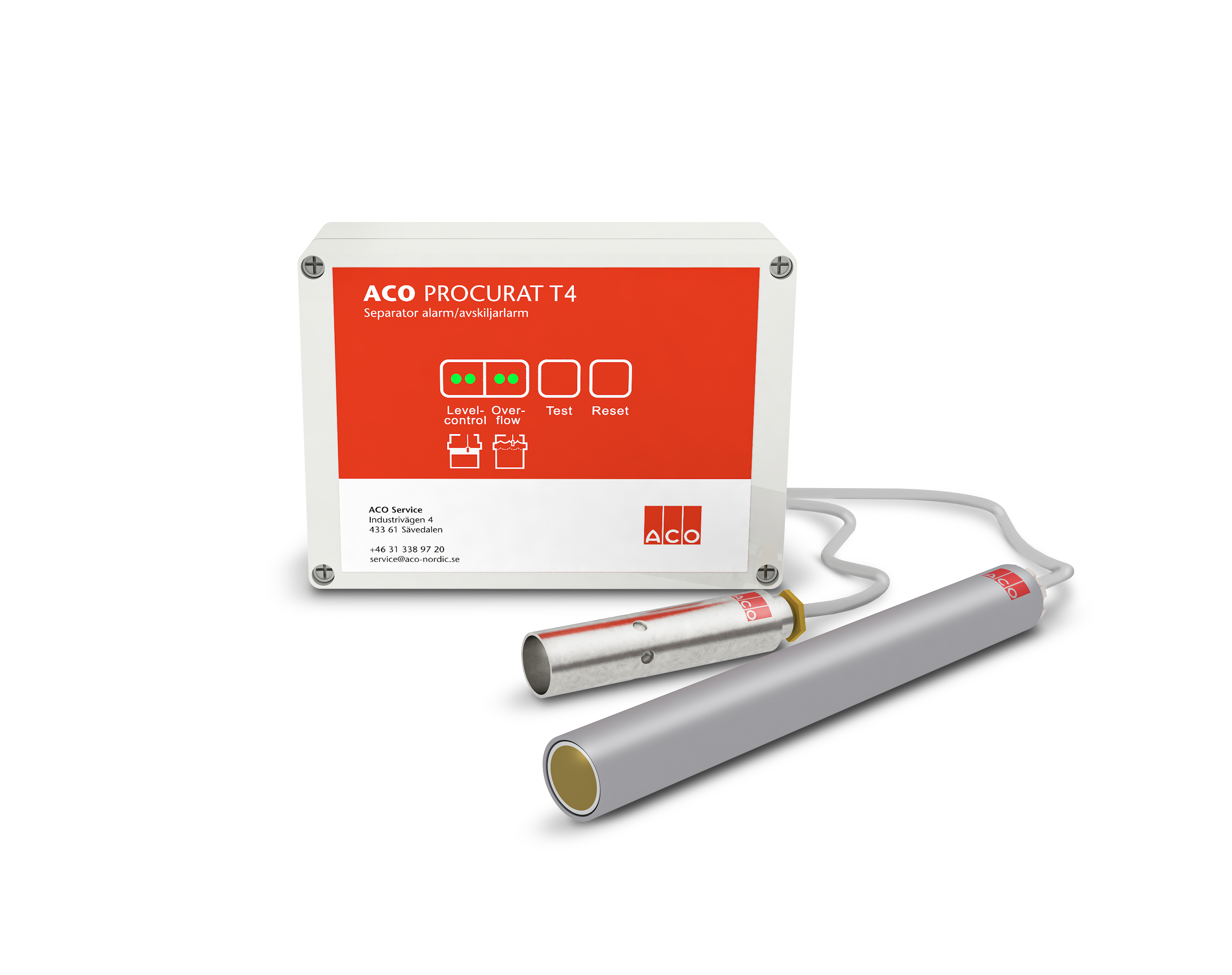 Avskiljarlarm med diodindikation. Ingång för nivå- och dämningsgivare. Levereras med centralenhet, nivå- och dämningsgivare.