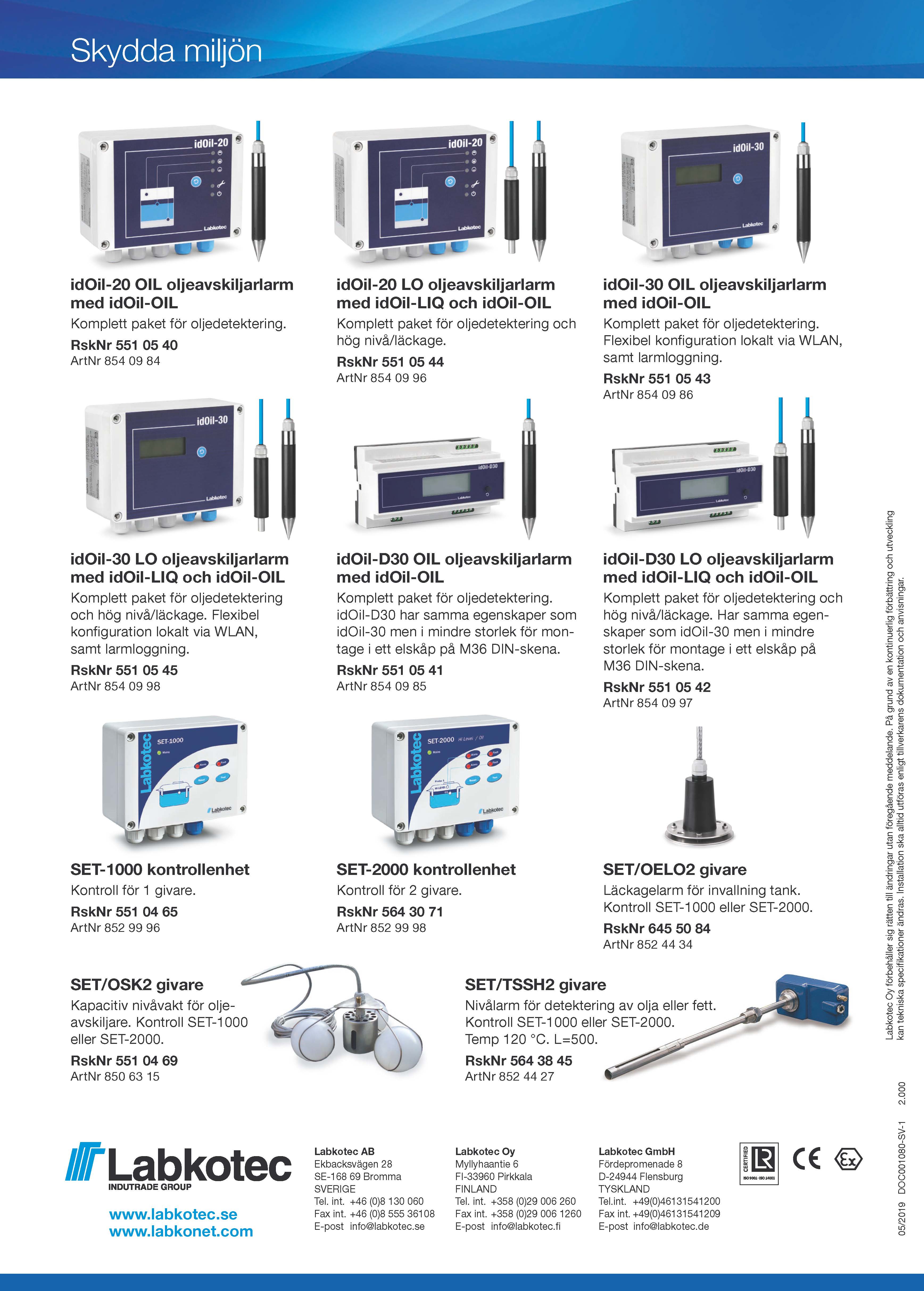 För Hög / Låg nivå larm Detektering av olja eller fett TÅL 120 C Variant för viskösa media finns också. L= 170 , 500, 800 mm som standard längre finns. Kontroll SET 1000 eller SET 2000