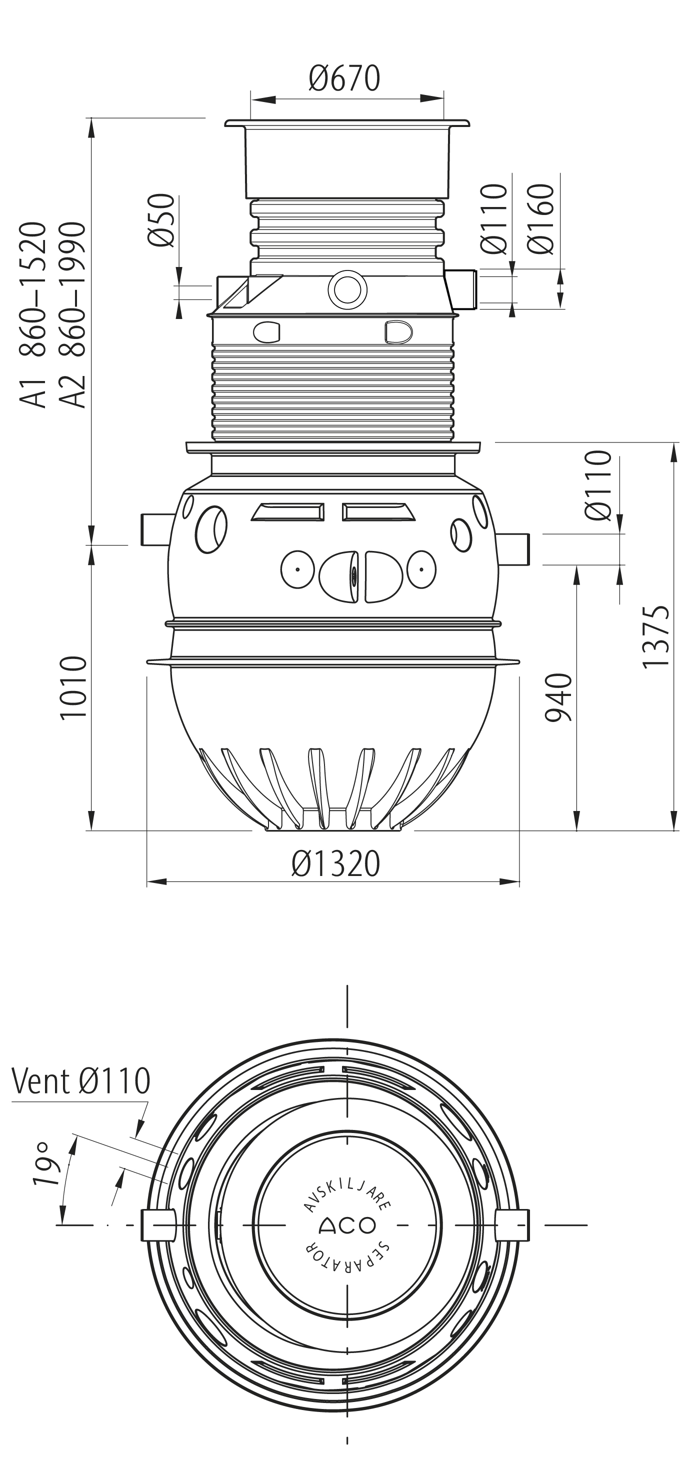 Grundpaket för catering och fastfood, 300 portioner/dag. Fettavskiljaren har en självförankrande konstruktion som utesluter risken för uppflytning vid grundvatten upp till 500 mm under färdig mark. Vid risk för högre grundvatten skall avskiljaren säkras med ett belastningsskydd, ACO Prefab. Tillverkad av PEHD med gummitäningar av NBR och SBR. Komplettera paketet med våra tillval som larm, provtagningsbrunn, belastningskydd m.m. A-mått = 850–1590 mm