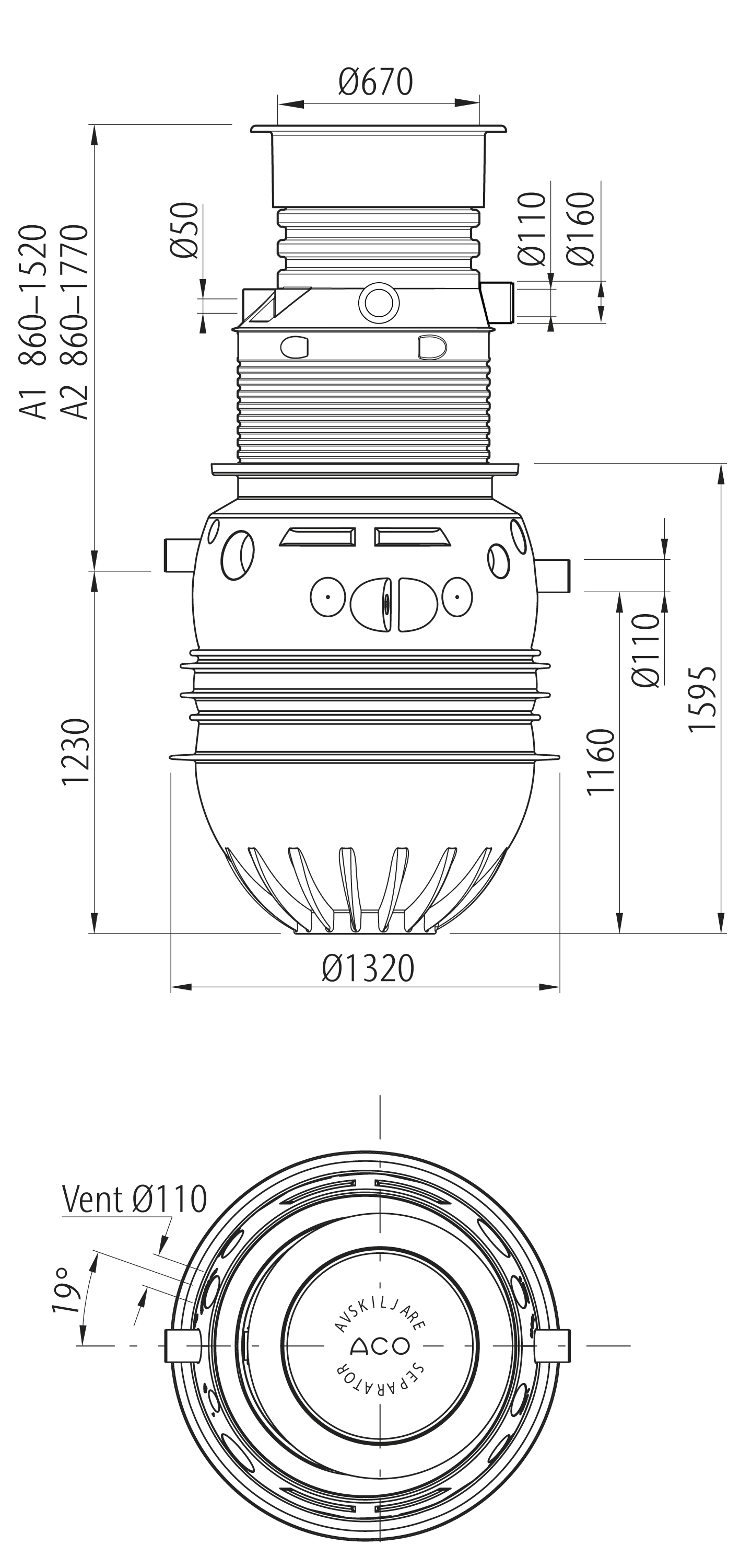 Grundpaket för catering och fastfood, 600 porttioner/dag. Fettavskiljaren har en självförankrande konstruktion som utesluter risken för uppflytning vid grundvatten upp till 500 mm under färdig mark. Vid risk för högre grundvatten skall avskiljaren säkras med ett belastningsskydd, ACO Prefab. Tillverkad av PEHD med gummitäningar av NBR och SBR. Komplettera paketet med våra tillval som larm, provtagningsbrunn, belastningskydd m.m. A-mått = 850–1590 mm