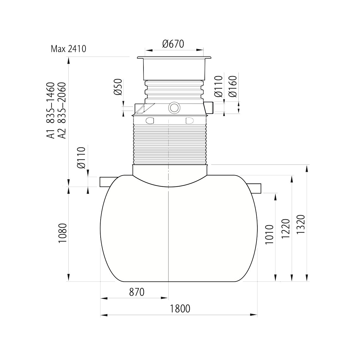 Horisontell självförankrad fettavskiljare i glasfiberarmerad polyester. Hals och betäckning ingår. A-mått: 835–2060 mm.