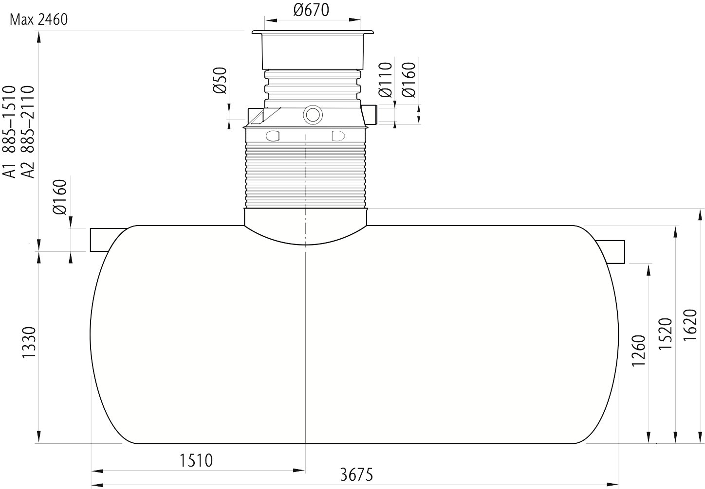 Horisontell fettavskiljare i glasfiberarmerad polyester. Hals, betäckning, lyftöglor och förankringssats ingår. A-mått: 885–1510 mm.