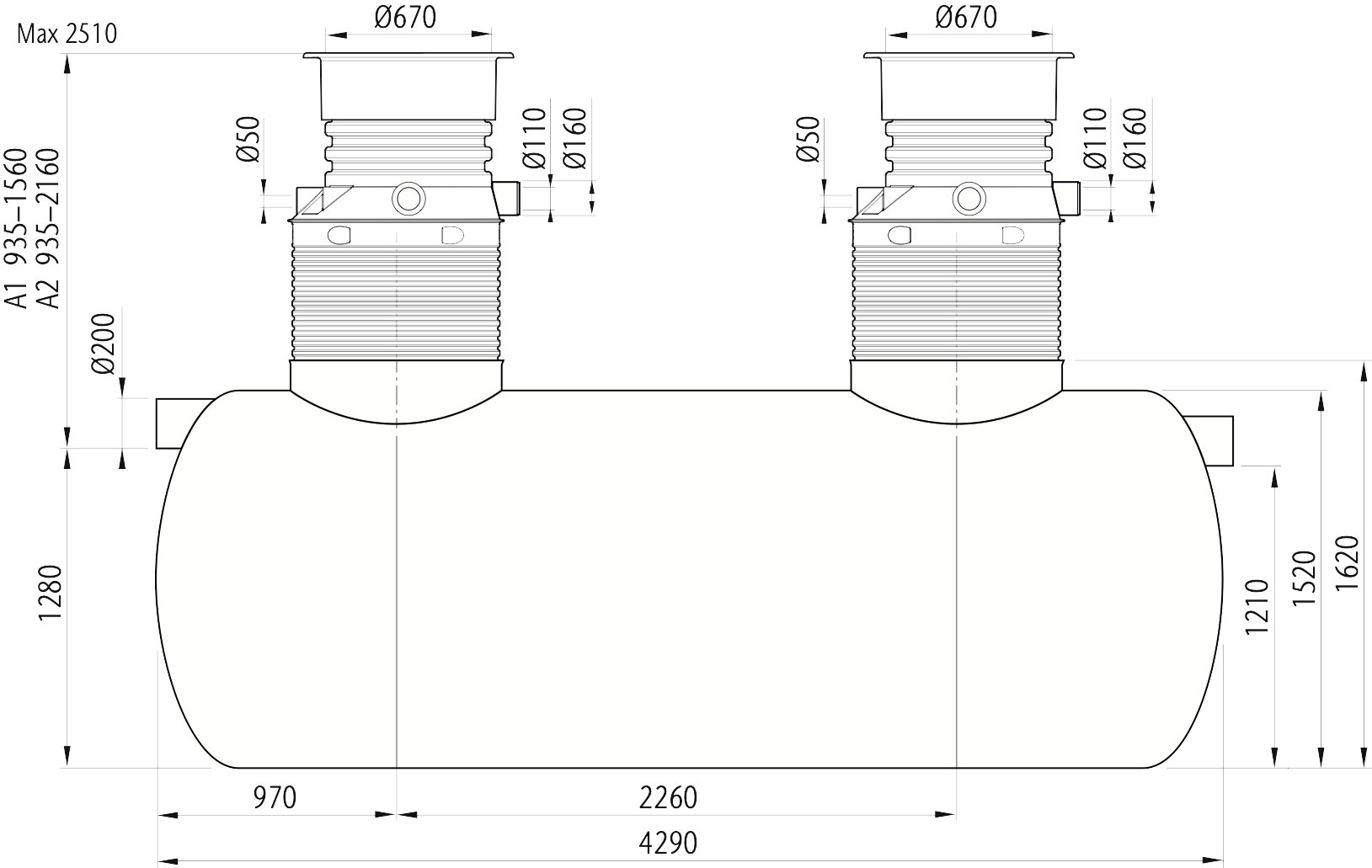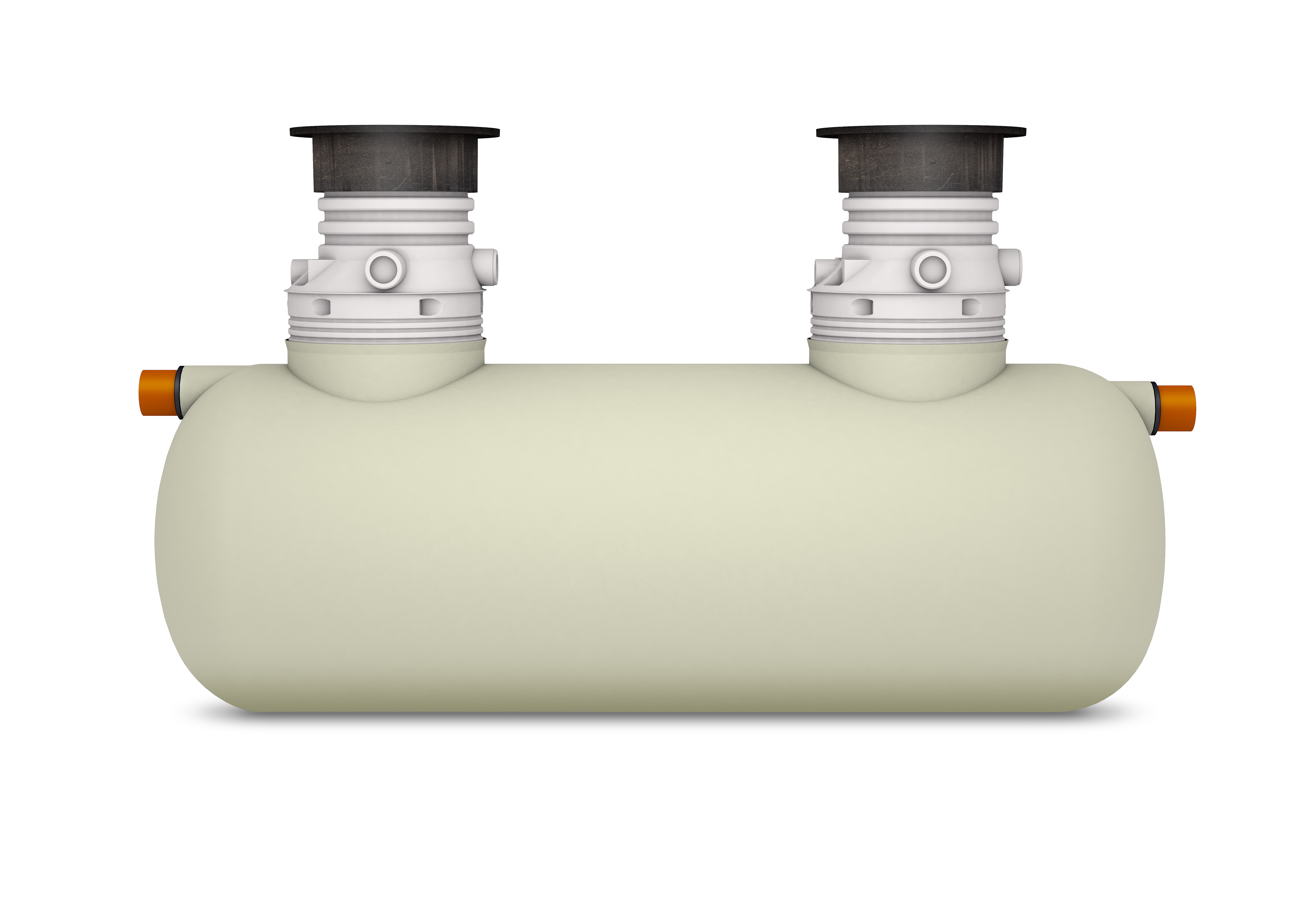 Horisontell fettavskiljare i glasfiberarmerad polyester. Hals, betäckning, lyftöglor och förankringssats ingår. A-mått: 935–2160 mm. DN200.