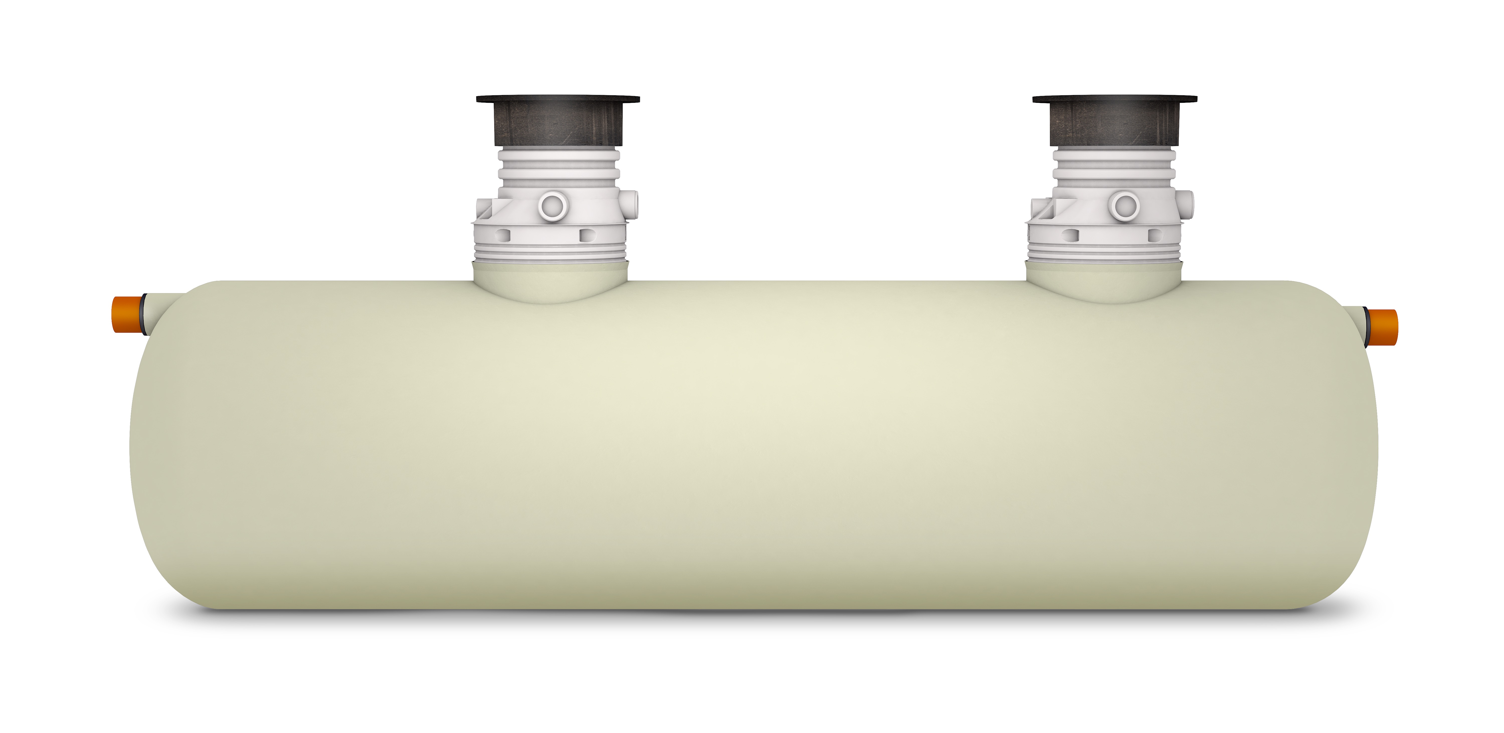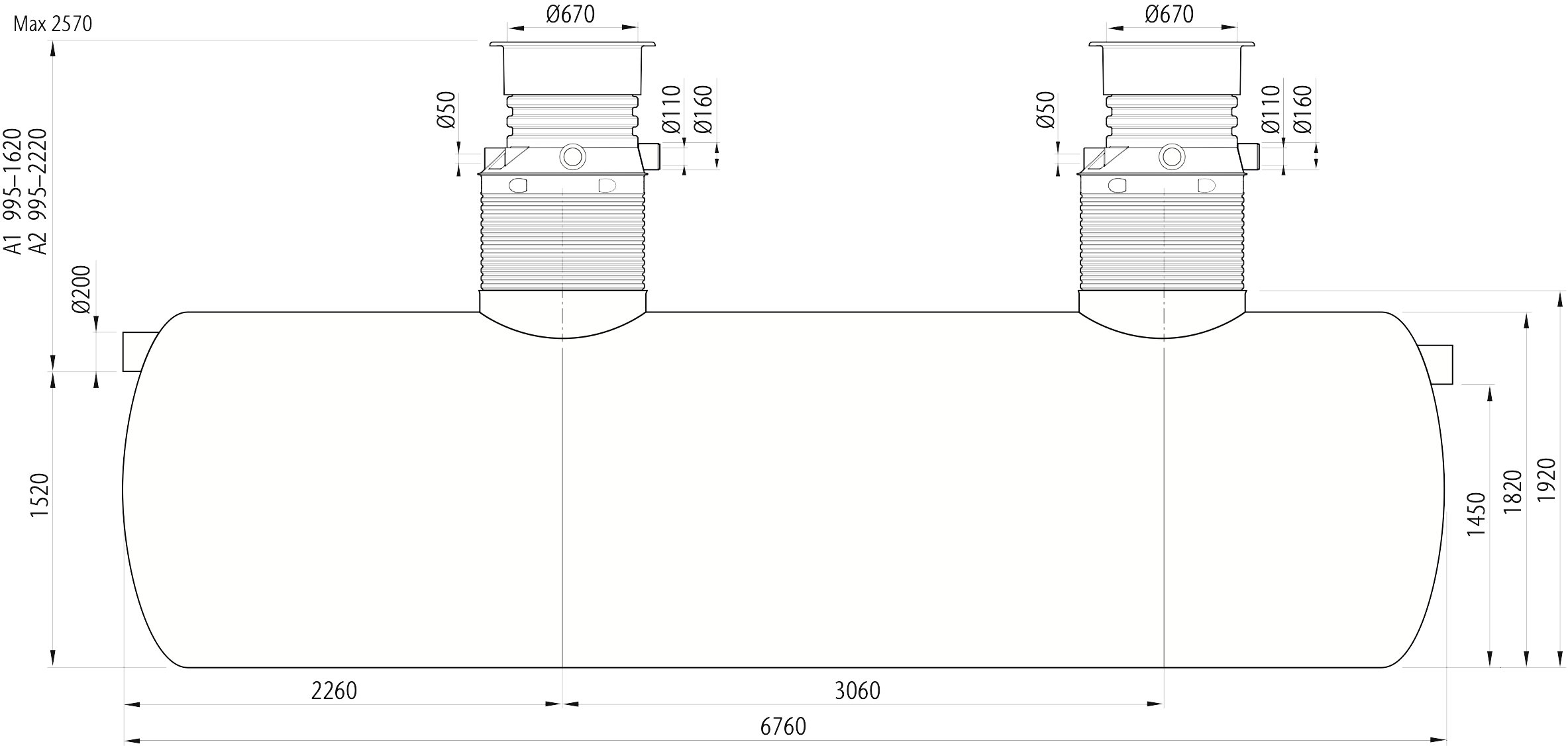 Horisontell fettavskiljare i glasfiberarmerad polyester. Hals, betäckning, lyftöglor och förankringssats ingår. A-mått: 995–1620 mm.