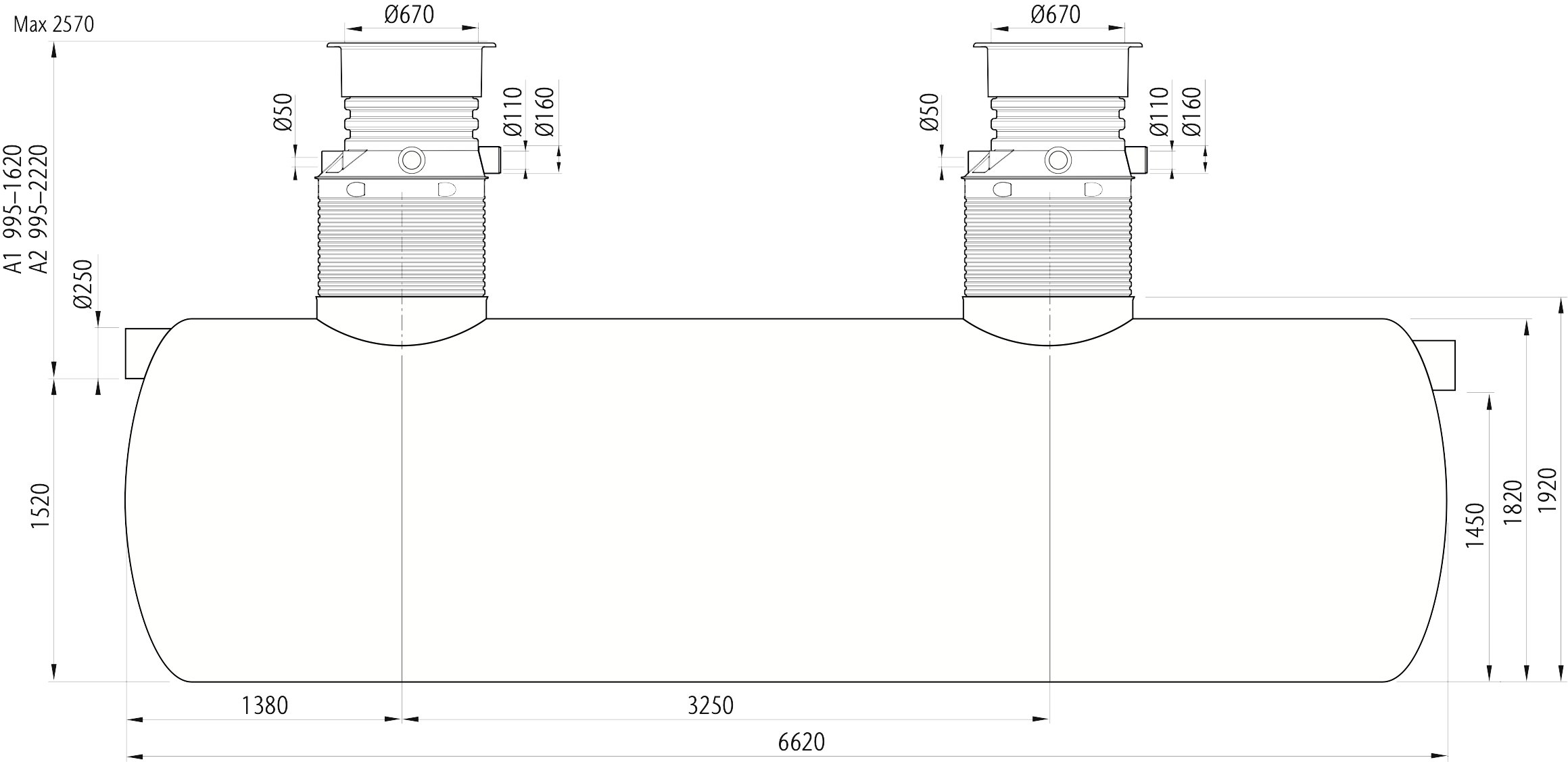 Horisontell fettavskiljare i glasfiberarmerad polyester. Hals, betäckning, lyftöglor och förankringssats ingår. A-mått: 995–1620 mm.
