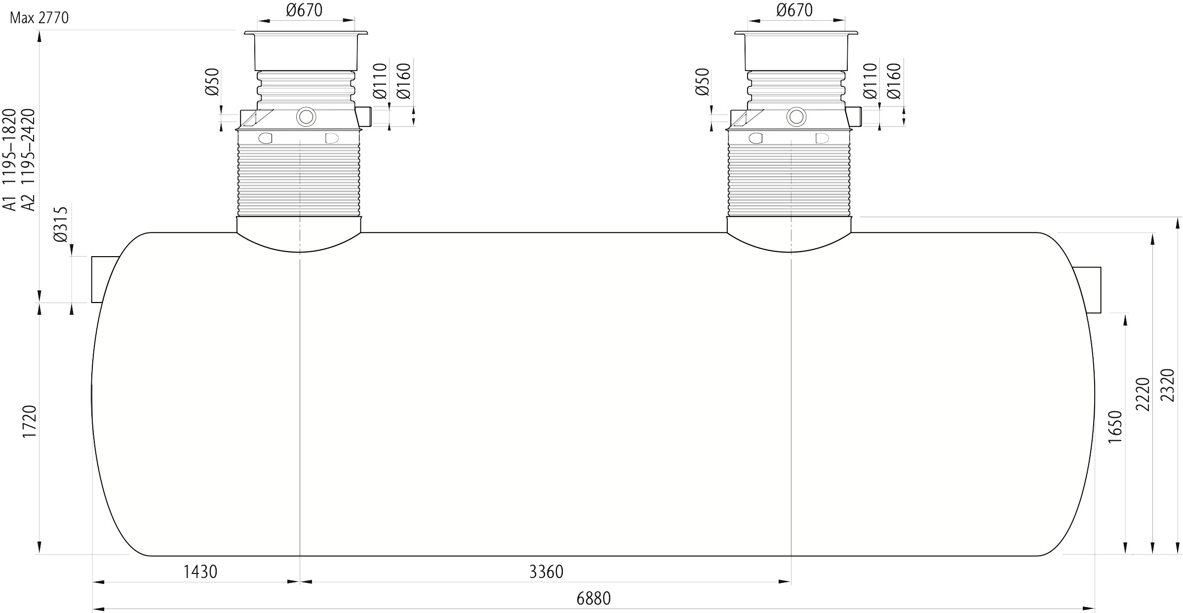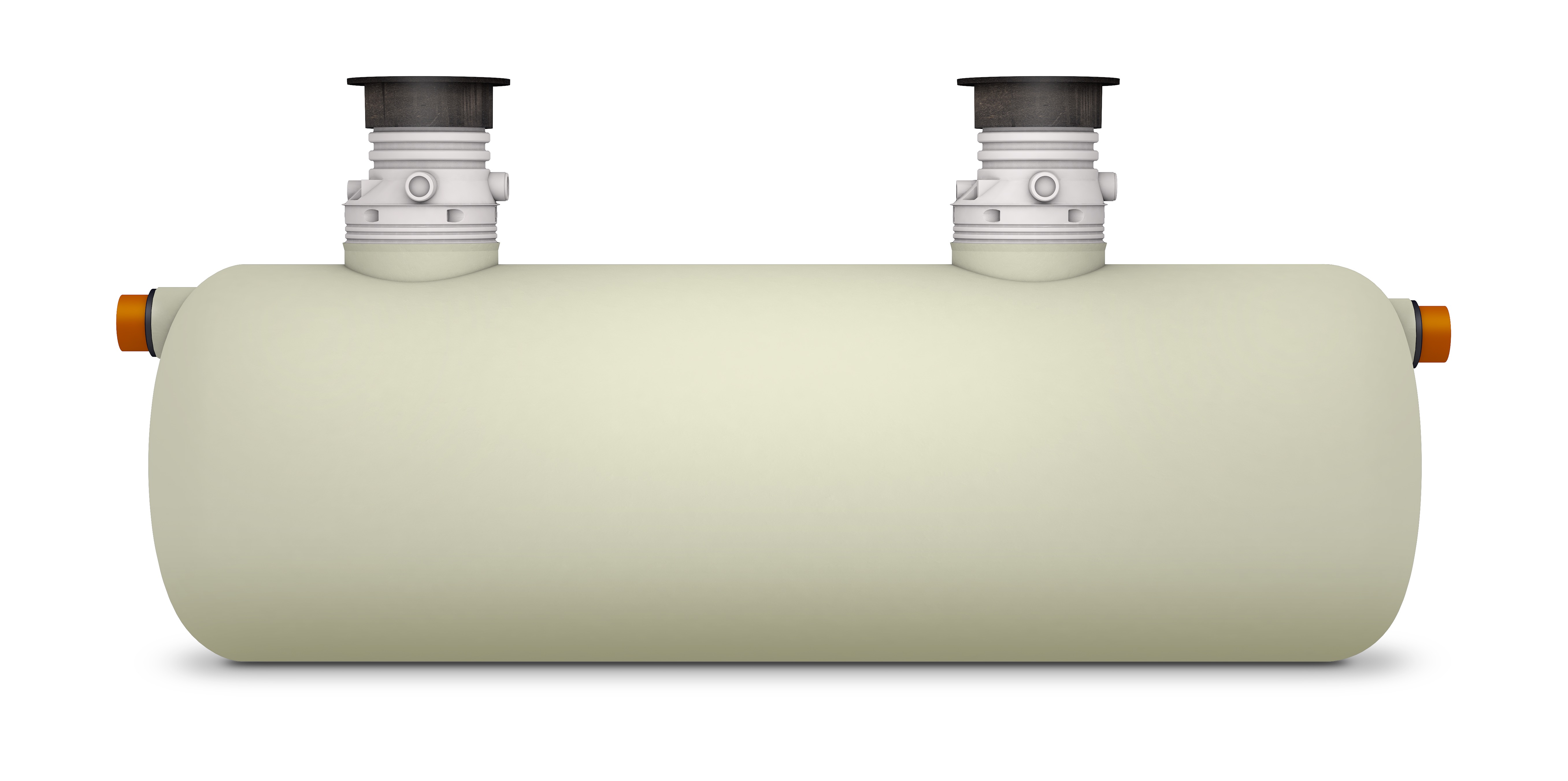 Horisontell fettavskiljare i glasfiberarmerad polyester. Hals, betäckning, lyftöglor och förankringssats ingår. A-mått: 1195–2420 mm.