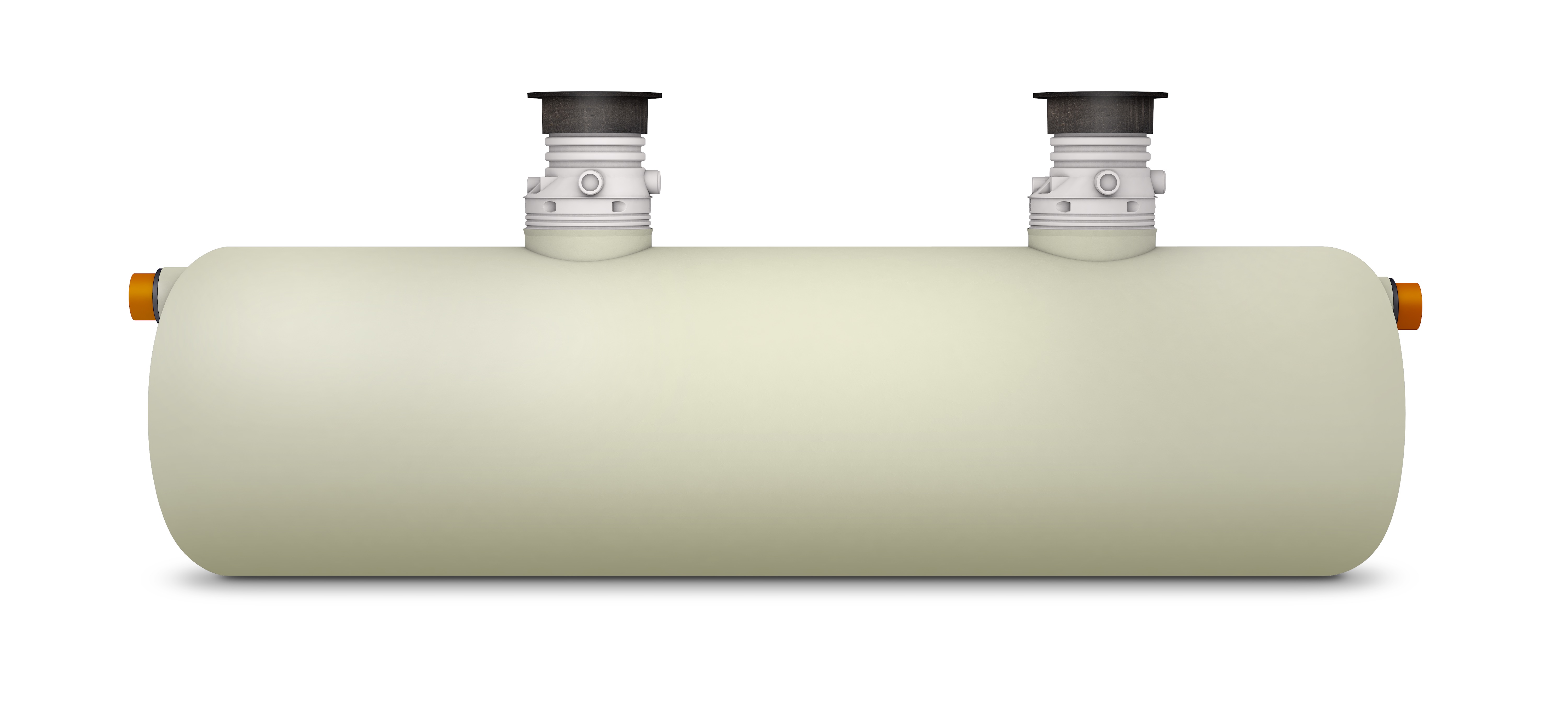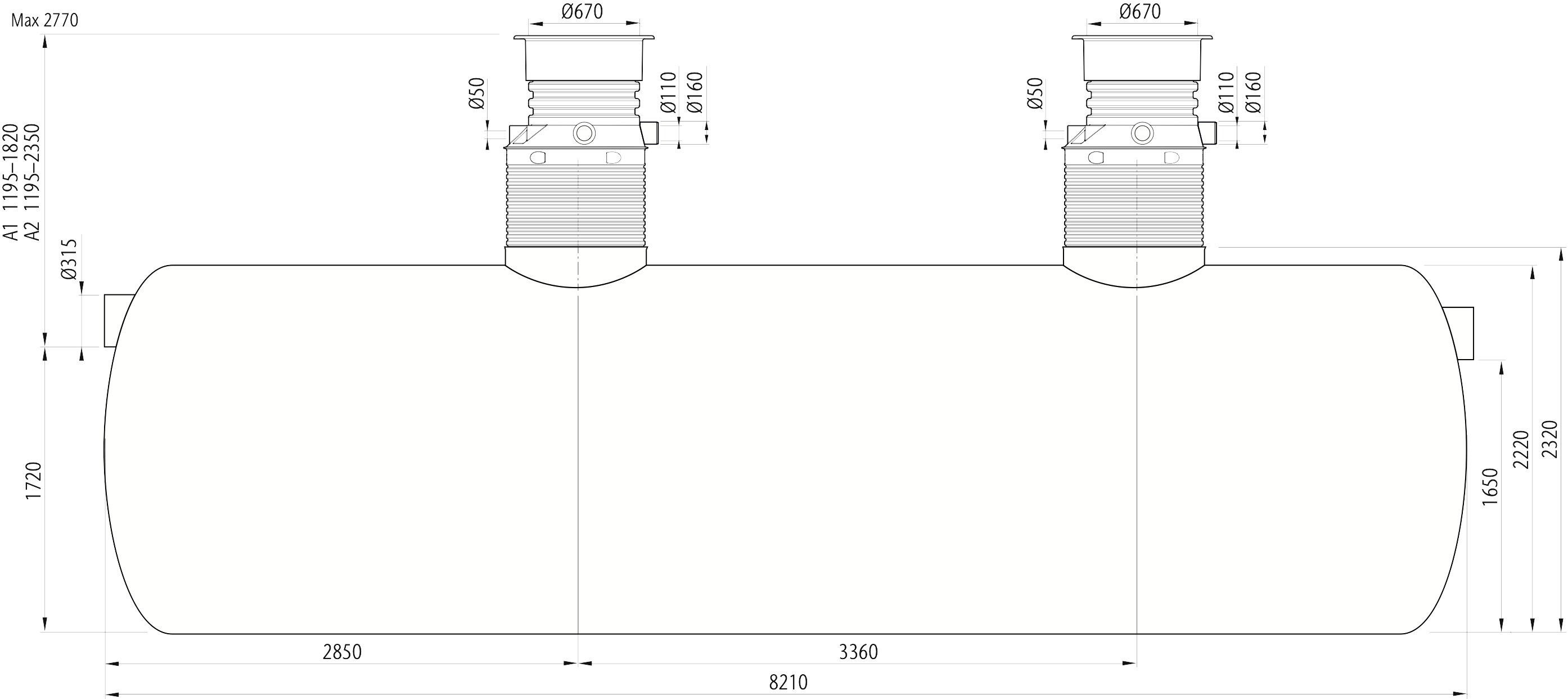 Horisontell fettavskiljare i glasfiberarmerad polyester. Hals, betäckning, lyftöglor och förankringssats ingår. A-mått: 1195–1820 mm.