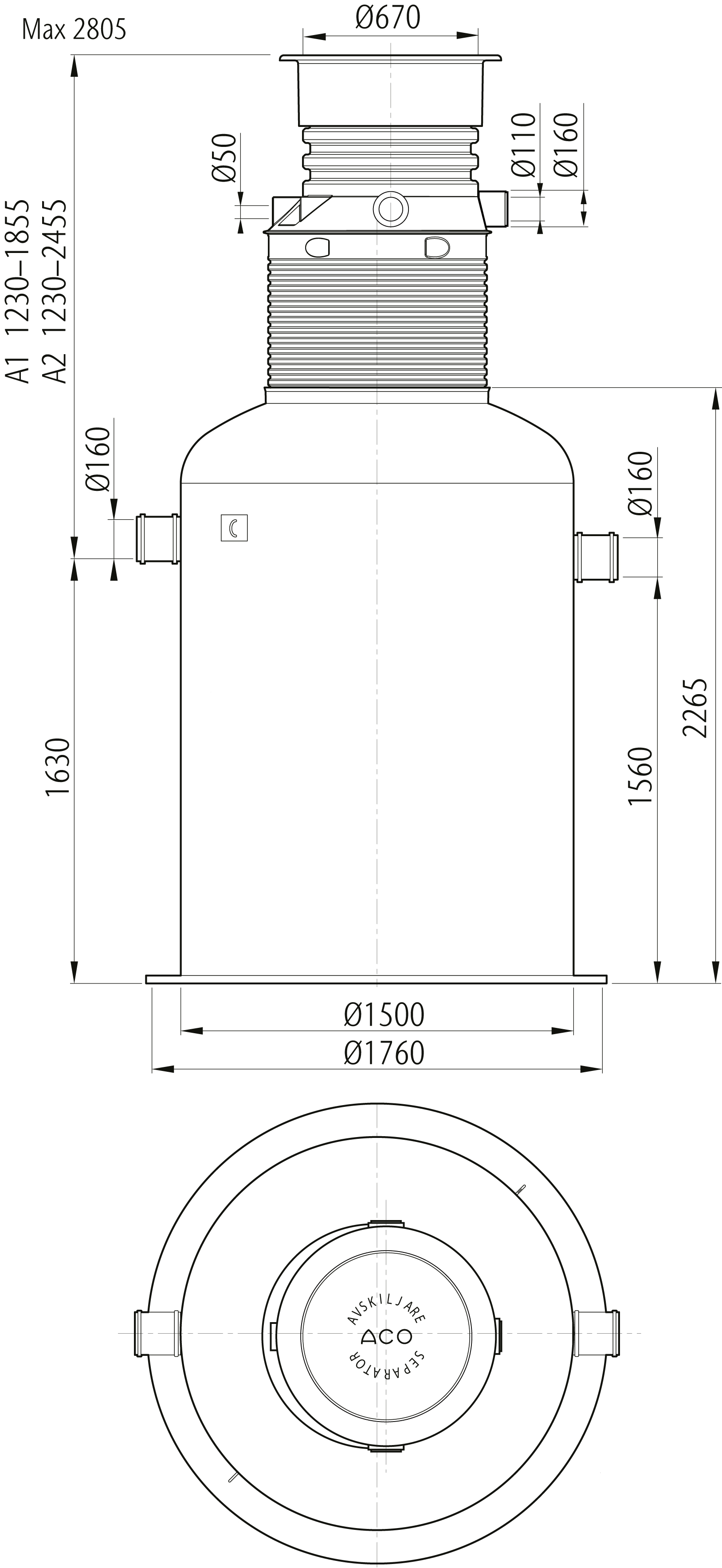 Lipumax G-B-serien är avsedd för behandling av fetthaltigt avloppsvatten från livsmedelsindustrier, storkök, restauranger, gatukök, bagerier m.fl. Avskiljarna är försedda med integrerat slamfång för slam och fasta partiklar. Alla modeller finns i två alternativa storlekar på slamfång beroende på behov i verksamheten. ACO Lipumax G-B är en självförankrande avskiljare försedd med ett läckagesäkert, gummiringstätat Ø 600/800 mm halssystem som lätt kan justeras i höjdled. Integrerat i halsen finns ett kabelrörsurtag Ø 50 mm som i kombination ACO Protight (tillval) ger snabb, läckage- och gasåterströmningssäker montering av larmgivare. A1-mått 1230-1855 mm