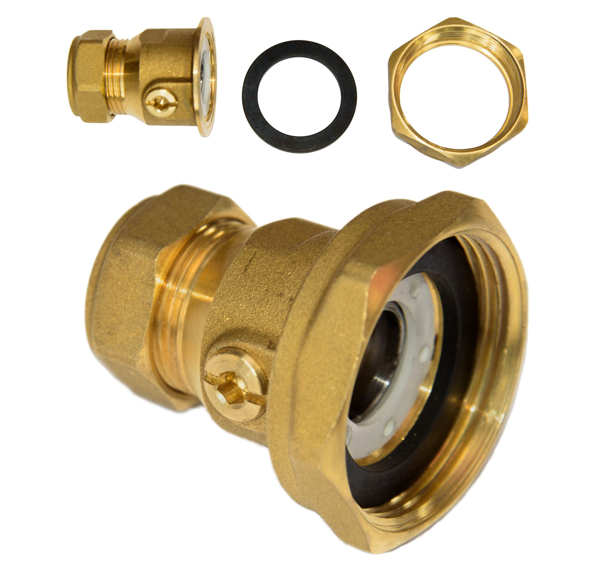 Flygt unionskoppling med avstängningsventil, 2 st. Gänga pump: R11/2". Gänga rör: 22 mmCu. Material: Mässing. Vikt: 0,44 kg. Längd: 140 mm, Bredd: 60 mm, Höjd: 60 mm