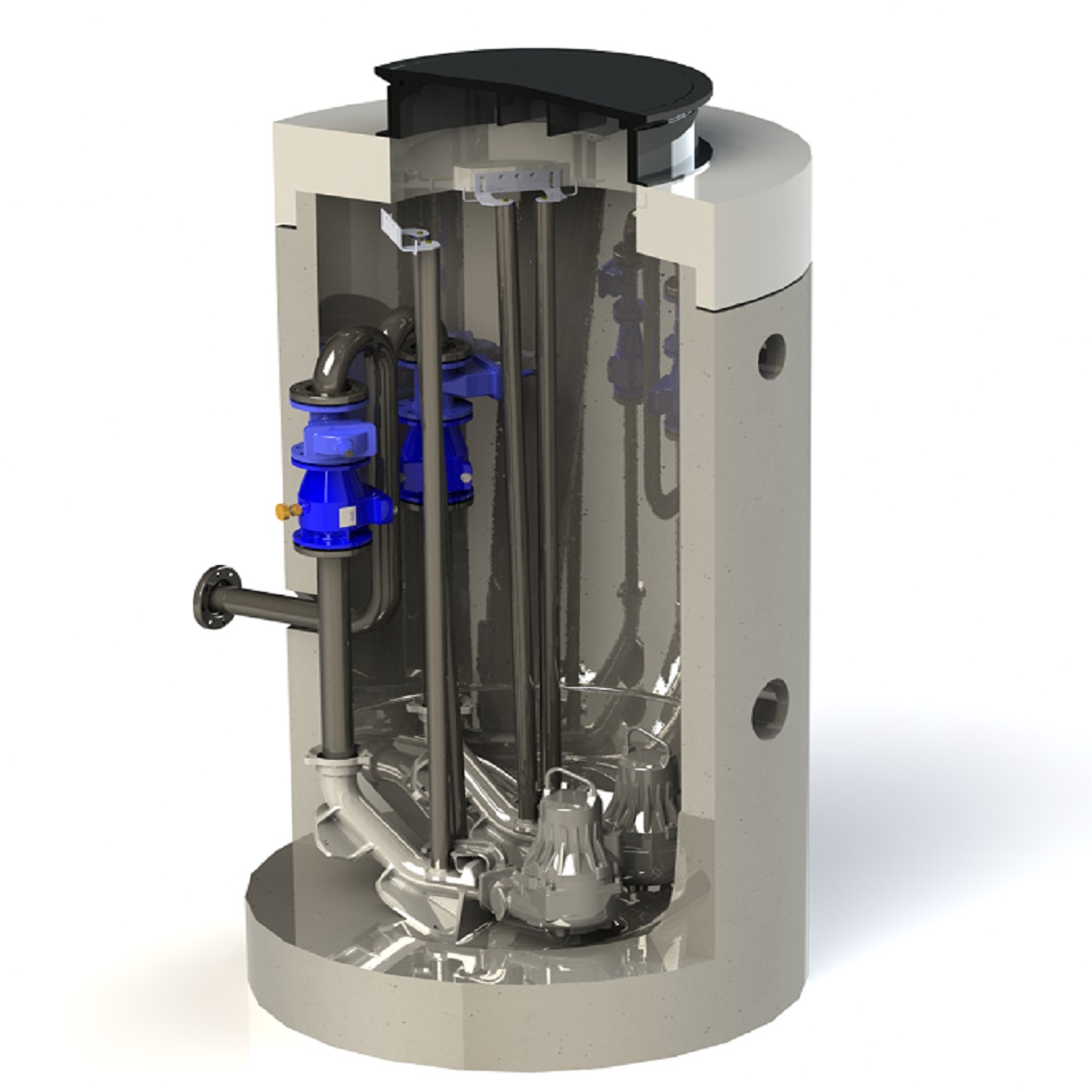 Norvatek Körbar pumpstation med DN 80 rörinredning. DN 1200, höjd 2725-2805. Med tät teleskopisk betäckning Densus 800. Inklusive 2st Flygt NX3069MT-160