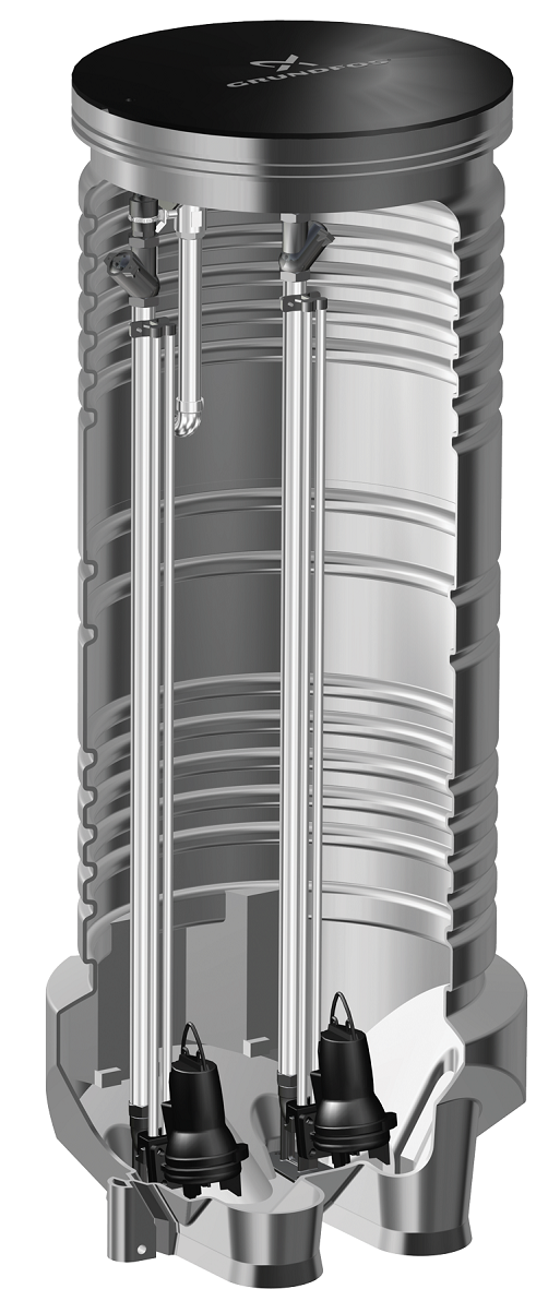 Pumpstation förberedd för SEG-pump (skärande). Komplett med kopplingsfot, gejdrör, utloppsrör med backventil och avstängningsventil, kätting, hävertbrytarventil och låsbart plastlock.