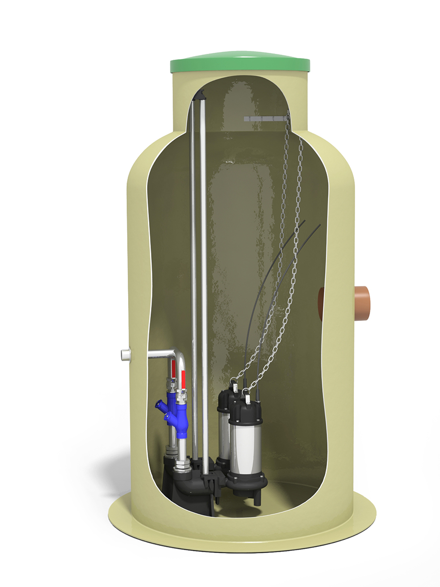 Pumpstation för markläggnng med 2 st skärande 3-fas pumpar GD-20-3, 1,5kW, 4Amp, Ø 1000 mm, med utomhuskapslat automatikskåp BN 2.