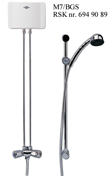 Komplett duschpaket (BGS) med tvågreppsblandare, duschset och duschmunstycke anpassat för ett vattenflöde under 4 liter/minut. Kallvattenanslutning på blandarens baksida. Utvändig 1/2".