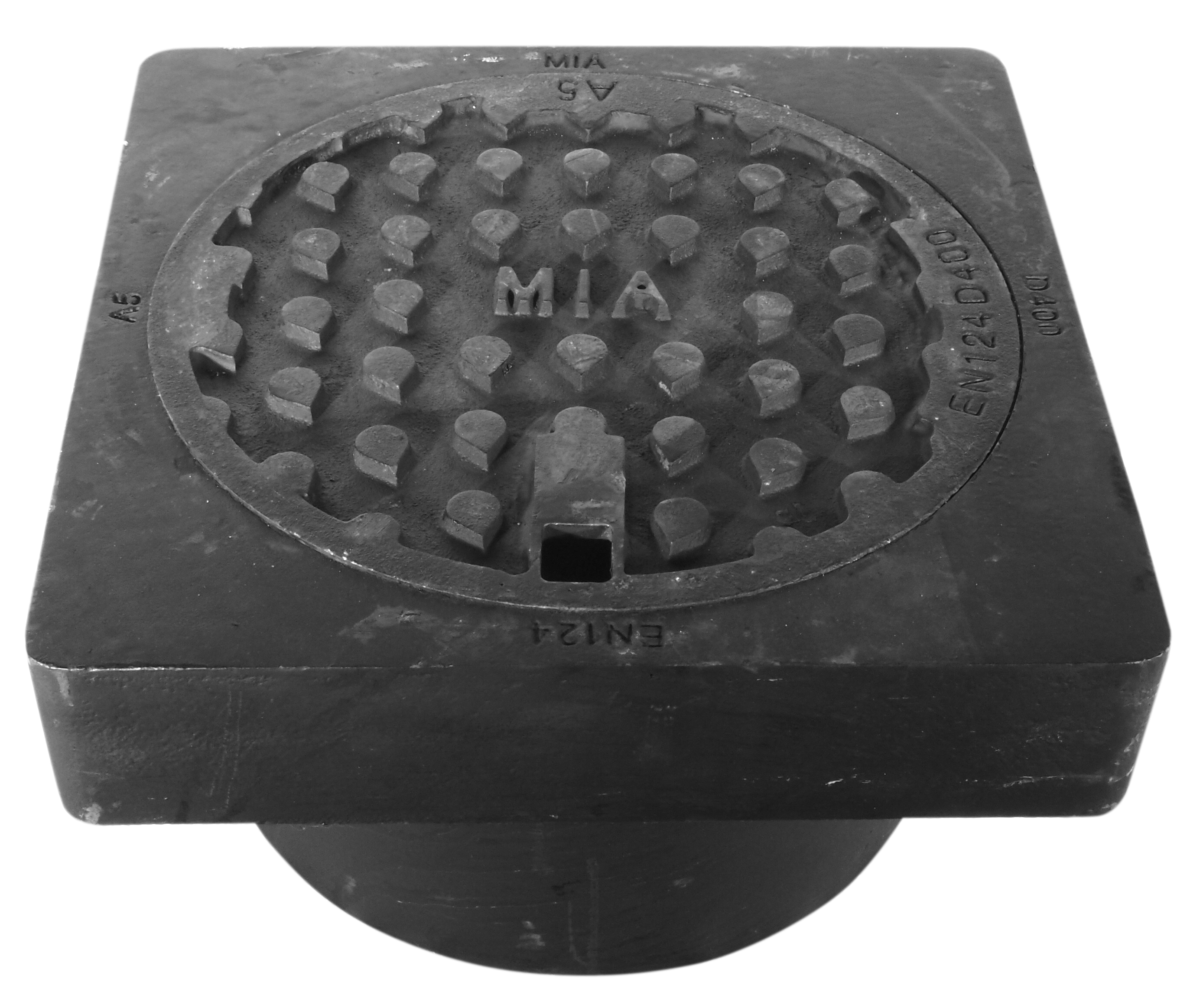 Fyrkantig A5 Flytande betäckning i segjärn, lock med låsarmar, slit/dämpring och tätt spetthål.