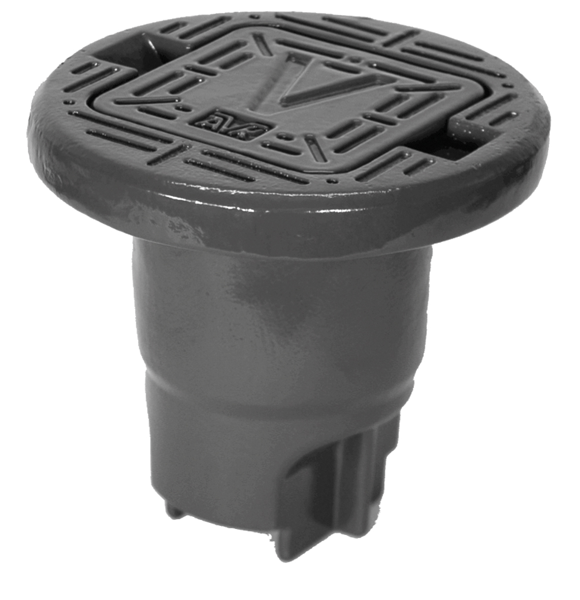 Rund betäckning av segjärn med fyrkantigt lock med inskription "V" och AVK logga. För AVK garnityr - målad med svart epoxy.