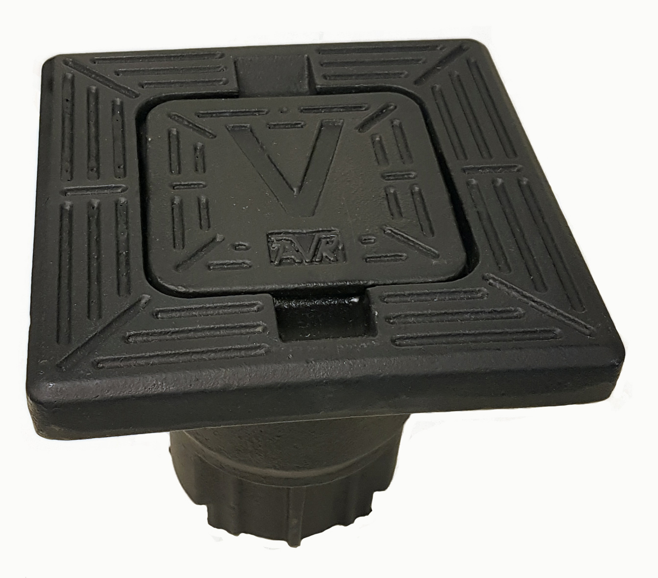 Fyrkantig betäckning av segjärn med fyrkantigt lock med inskription "V" och AVK logga. För AVK garnityr - målad med svart epoxy.