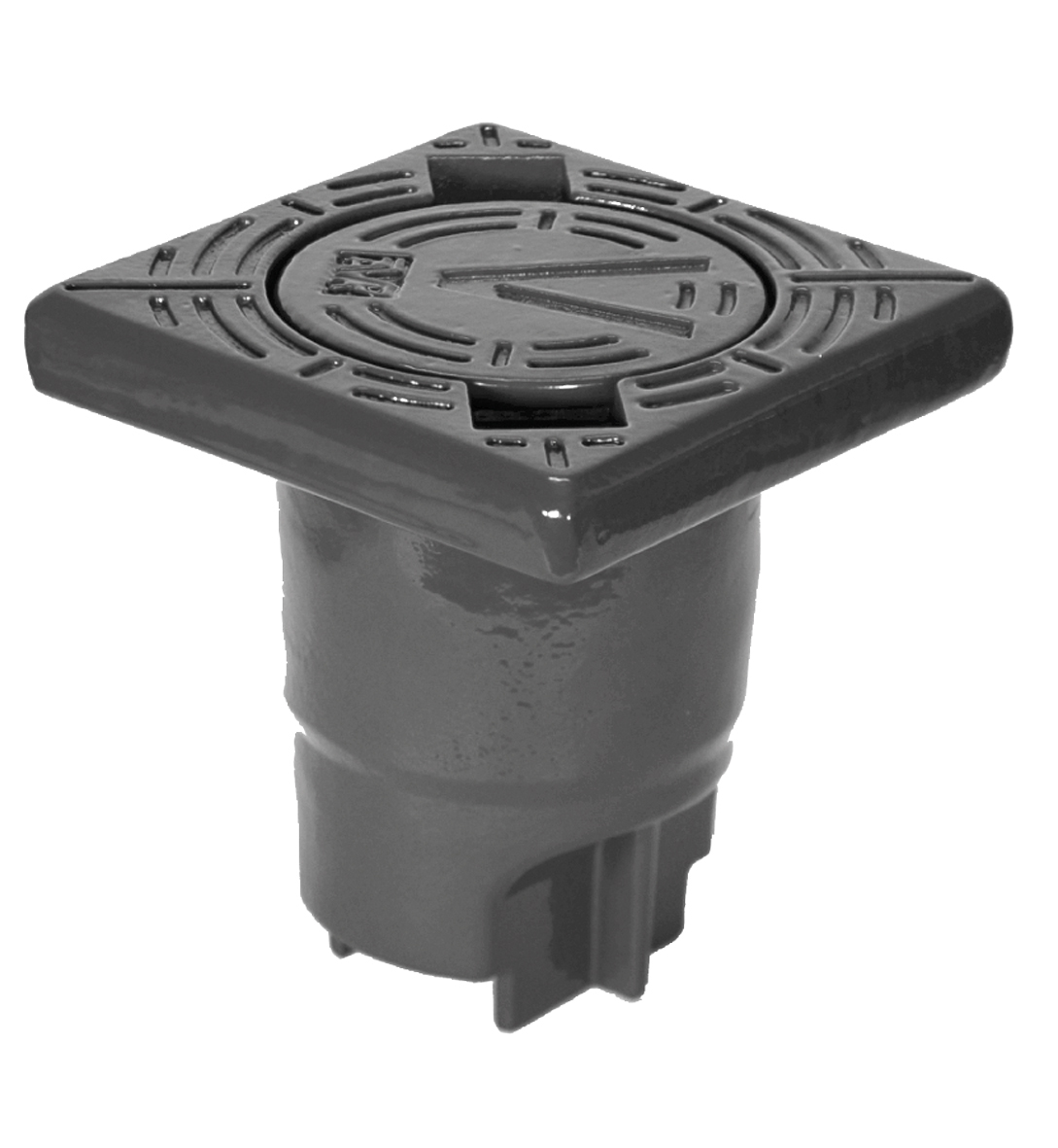 Fyrkantig betäckning av segjärn med runt lock med inskription "V" och AVK logga. För AVK garnityr - målad med svart epoxy.