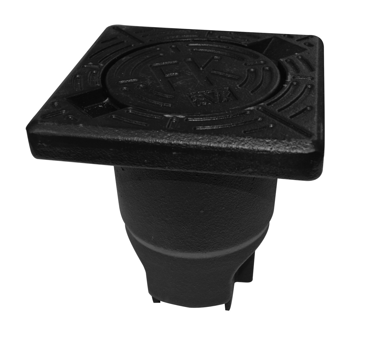 Fyrkantig betäckning av segjärn med runt lock med inskription "FK" och AVK logga. För AVK garnityr - målad med svart epoxy.