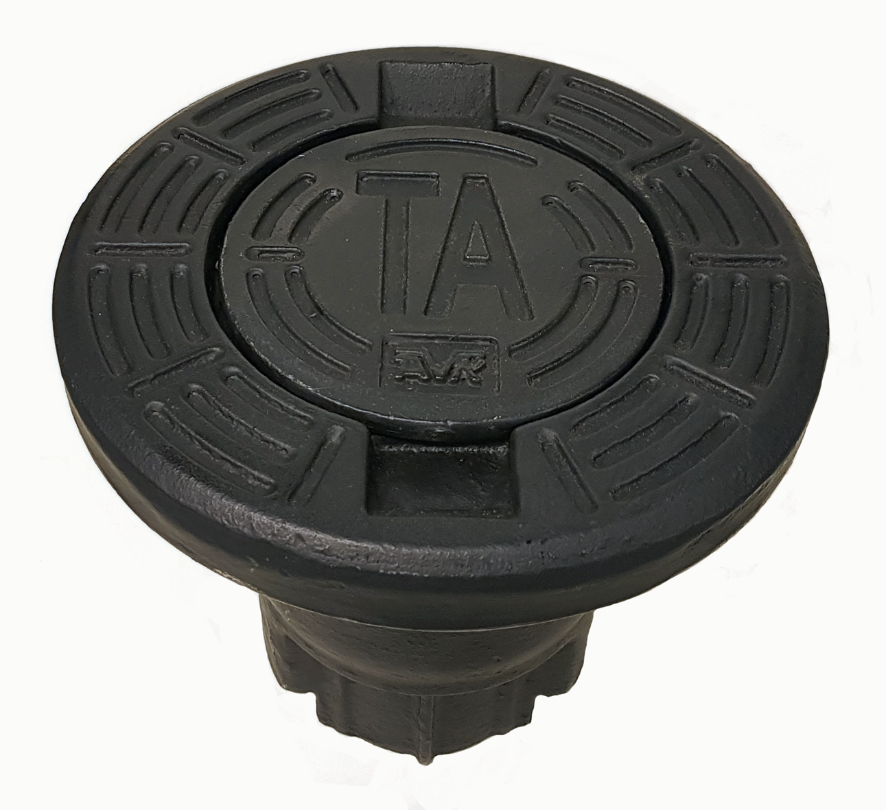 Rund betäckning av segjärn med runt lock med inskription "TA" och AVK logga. För AVK garnityr - målad med svart epoxy.