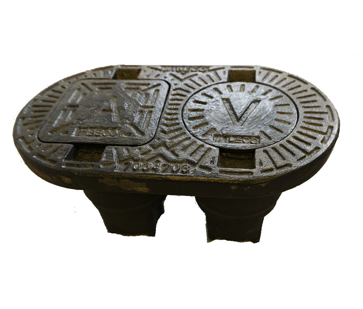 Runt lock märkt V för vatten, fyrkantligt lock märkt A för avlopp