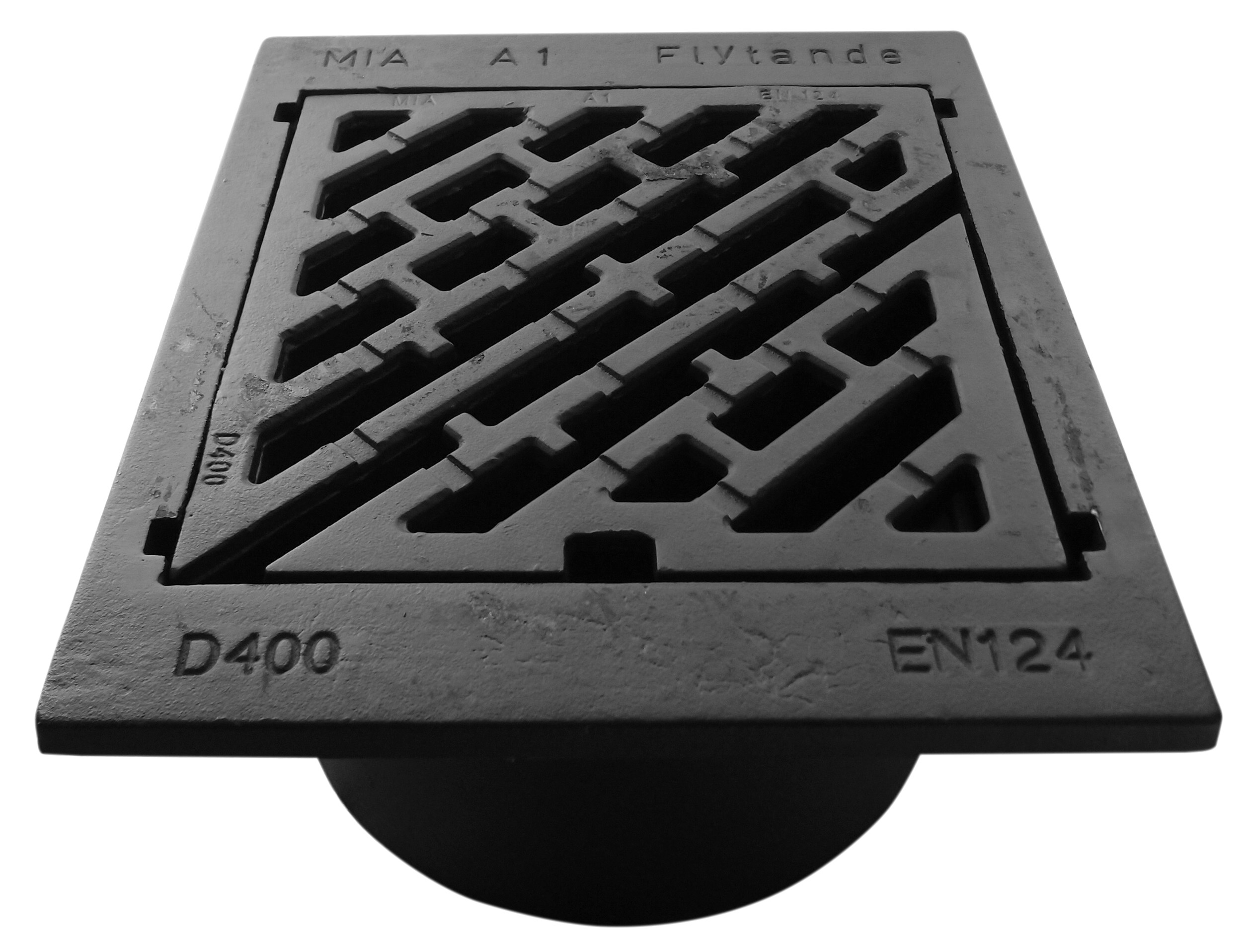 Flytande/variabel betäckning med diagonalt, självlåsande galler med gångjärn och 3-punktsupplag. I segjärn, för dagvattenbrunn med dagöppning 400mm.