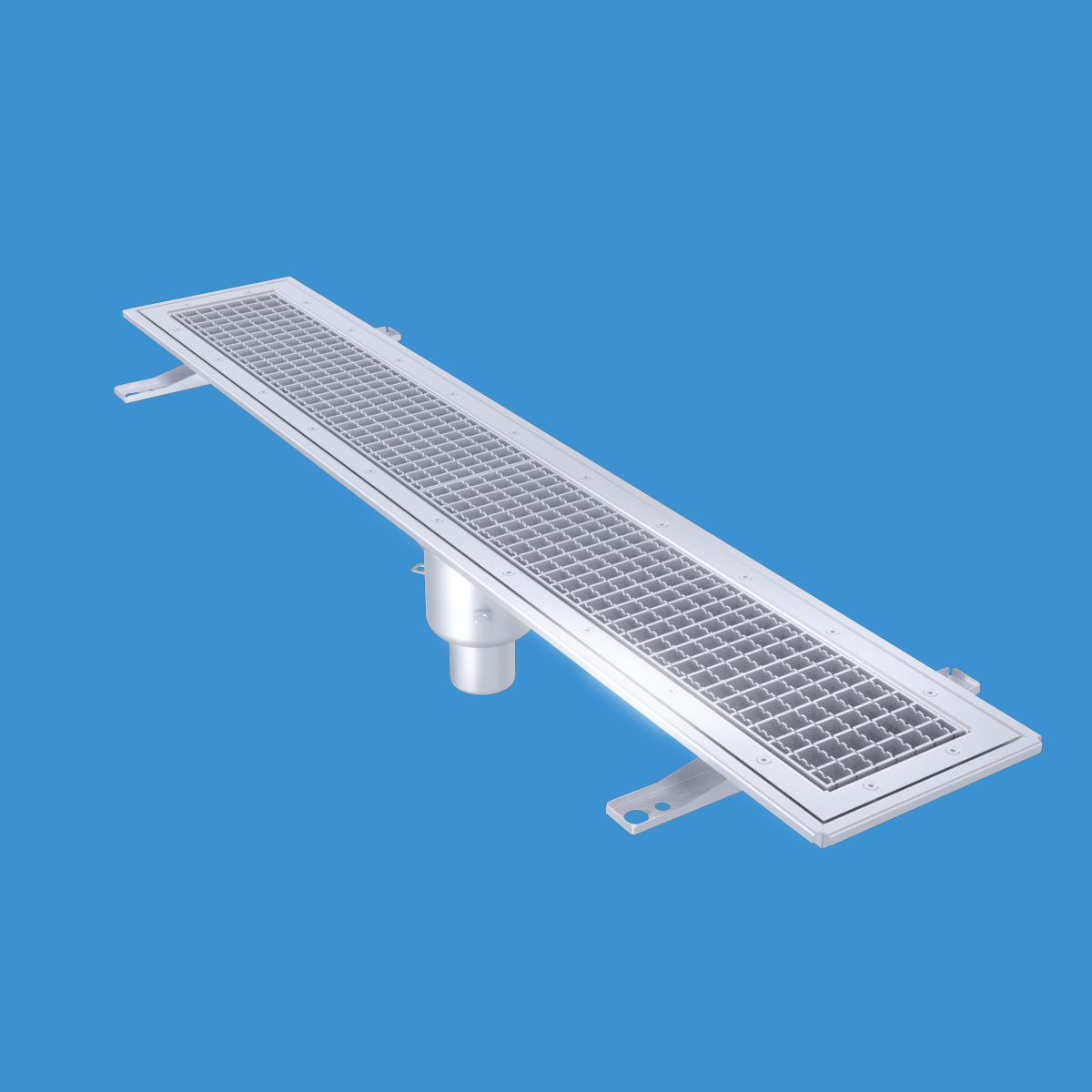 FURO 115 för bl.a. storkök och industri med lättare belastningar. Av syrafast rostfritt stål med bottenutlopp Ø75 mm, fyrkantöverdel med galler L15 dim. 1300x150 mm. För golv med plastmatta. Komplettera ev. med silkorg 7119548.