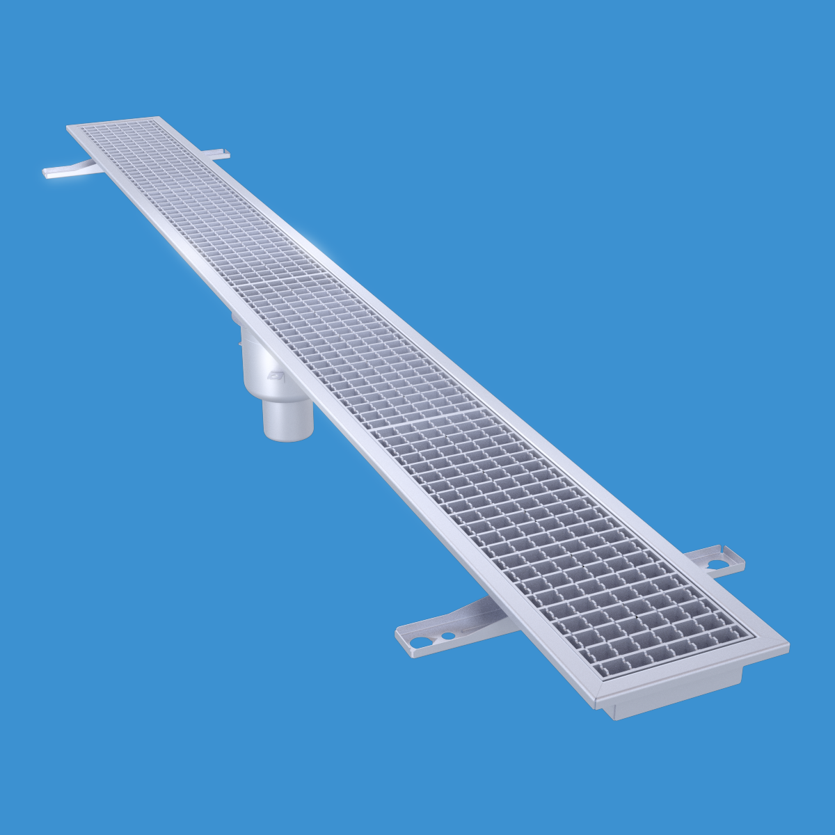 FURO 115 för bl.a. storkök och industri med lättare belastningar. Av syrafast rostfritt stål med bottenutlopp Ø75 mm, fyrkantöverdel med galler L15 dim. 2000x150 mm. För Klinkergolv K3, utan tätskikt alt. Stålslipat betonggolv. Komplettera ev. med silkorg 7119548.