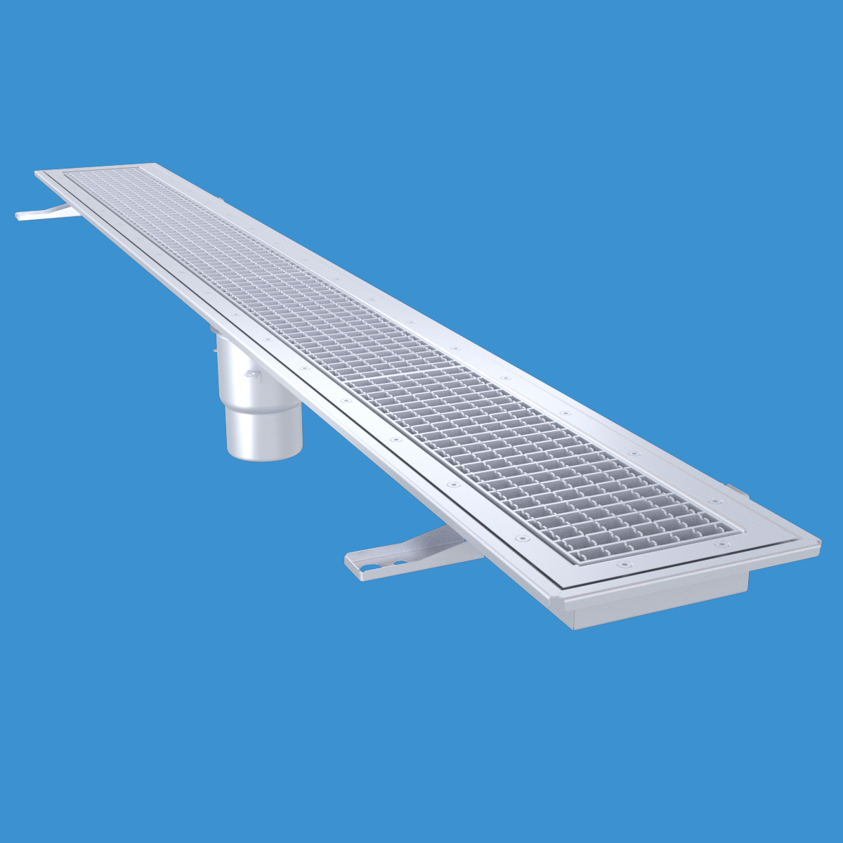 FURO 115 för bl.a. storkök och industri med lättare belastningar. Av syrafast rostfritt stål med bottenutlopp Ø110 mm, fyrkantöverdel med galler L15 dim. 2000x150 mm. För golv med plastmatta. Komplettera ev. med silkorg 7119548.