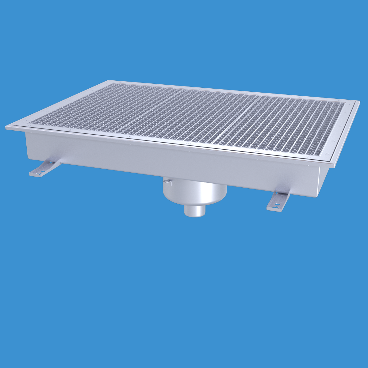 FURO 113 för bl.a. storkök och industri med lättare belastningar. Av syrafast rostfritt stål med bottenutlopp Ø75 mm. 150 mm djup fyrkantöverdel med galler L15 dim. 900x600 mm. För golv med plastmatta. Komplettera ev. med silkorg 7120796.