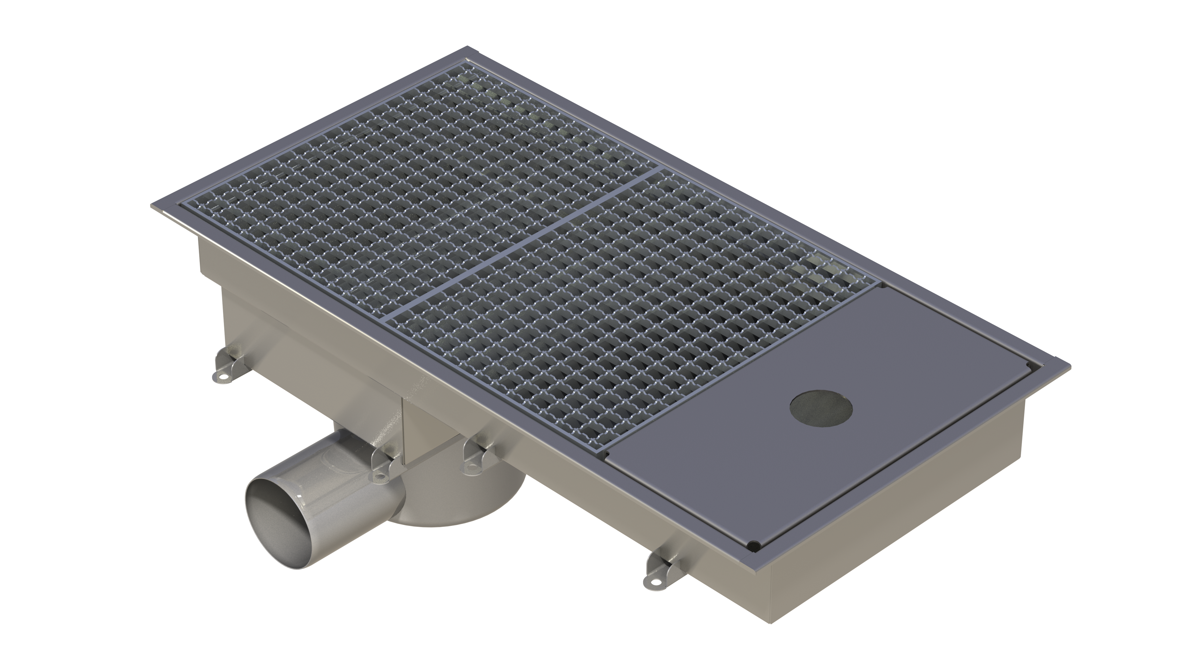 Städrumsbrunn för massagolv i t.ex. storkök eller industri. Utförs i EN 1.4301 alternativt Syrafast EN 1.4404 mot förfrågan. Urtagbart vattenlås & silkorg ingår.