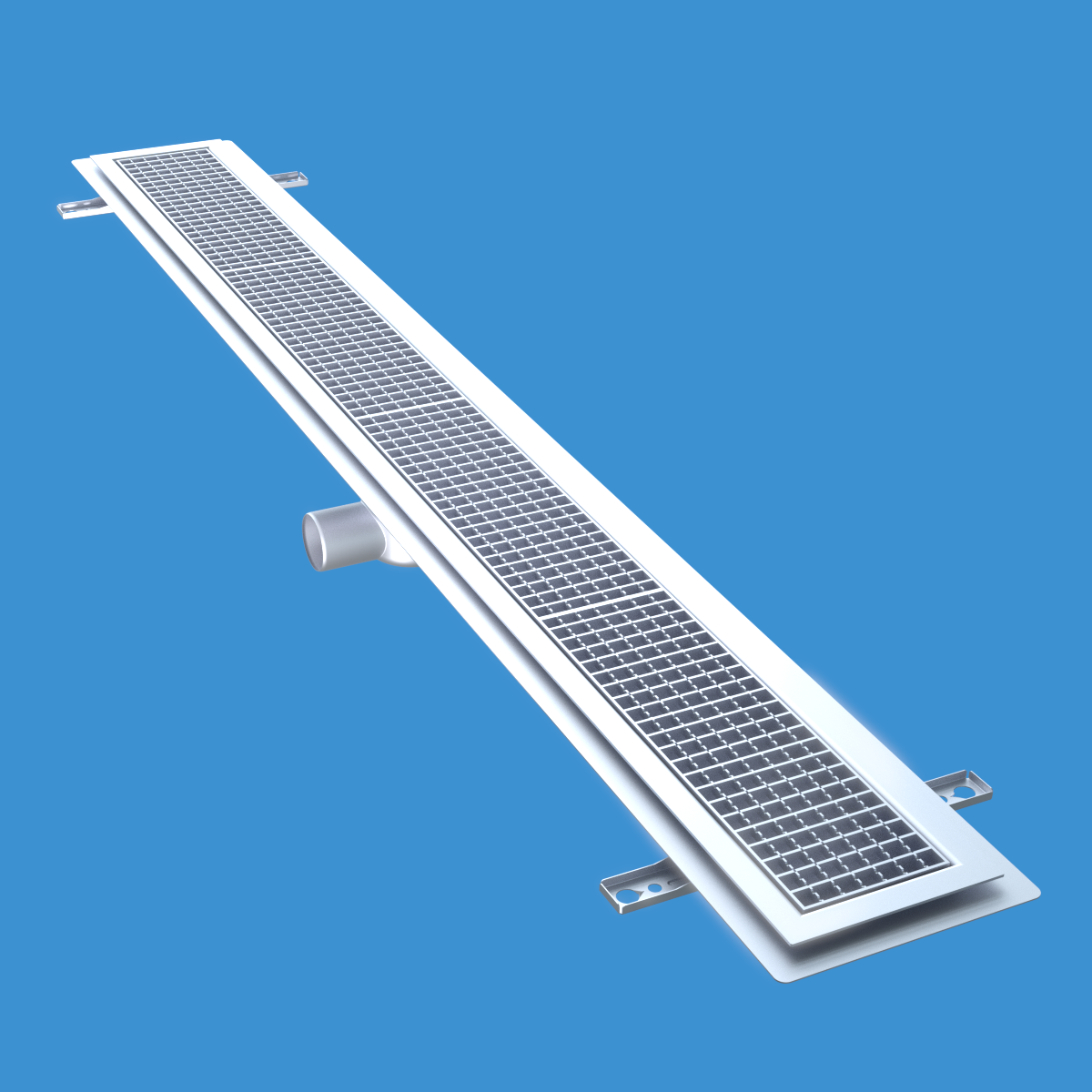 FURO 115 för bl.a. storkök och industri med lättare belastningar. Av syrafast rostfritt stål med sidoutlopp Ø75 mm, fyrkantöverdel med galler L15 dim. 2000x150 mm. För Klinkergolv K4, tätskikt som klistras mot klisterfläns. Komplettera ev. med silkorg 7119548.