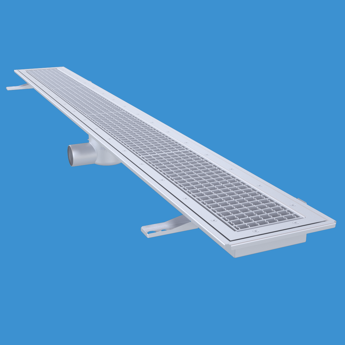 FURO 115 för bl.a. storkök och industri med lättare belastningar. Av syrafast rostfritt stål med sidoutlopp Ø75 mm, fyrkantöverdel med galler L15 dim. 2000x150 mm. För golv med plastmatta. Komplettera ev. med silkorg 7119548.