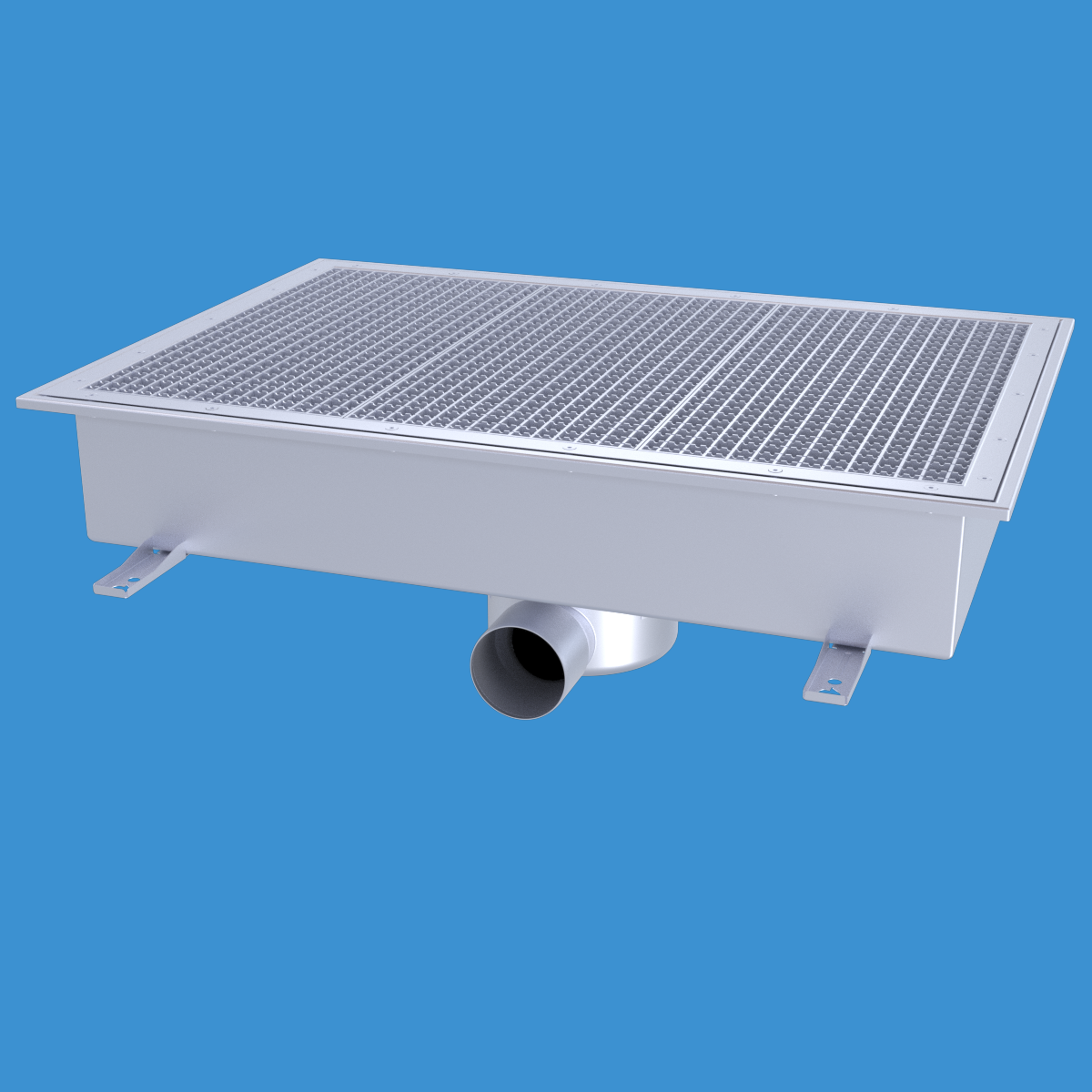 FURO 113 för bl.a. storkök och industri med lättare belastningar. Av syrafast rostfritt stål med sidoutlopp Ø110 mm. 200 mm djup fyrkantöverdel med galler L15 dim. 900x600 mm. För golv med plastmatta. Komplettera ev. med silkorg 7120796.