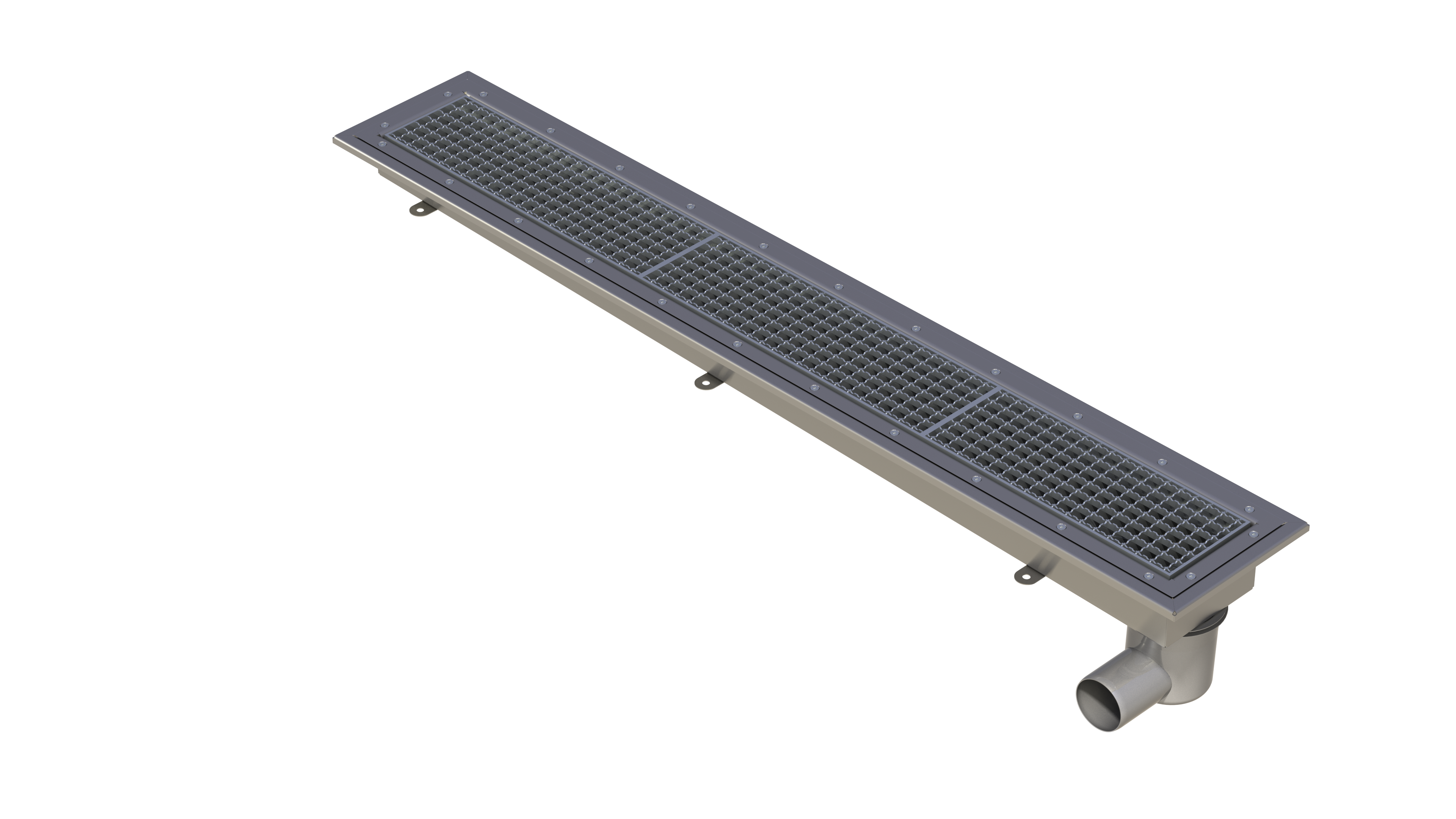 Golvränna för golv med plastmatta i t.ex. storkök eller industri. Utförs i EN 1.4301 alternativt Syrafast EN 1.4404 mot förfrågan. Urtagbart vattenlås & silkorg ingår.