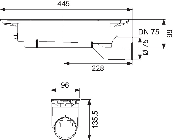 Min. installationshöjd 135,5 mm (nedre kanten av avloppet till övre kant av modul)