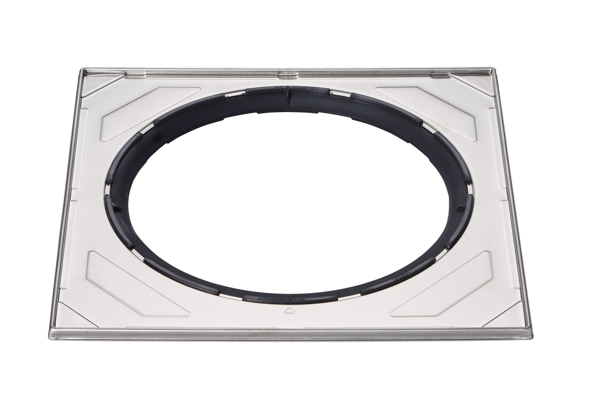Lägg ramen på brunnen och vrid den svarta regleringsringen till önskad ställning beroende på hur klinkerplattorna har fördelats. Den maximala regleringen av ramen är 15 mm i en riktning. Regleringsområdets storlek är 30 mm. Fixera klinkerramen med fästlim ovanpå tätskiktet. Ta inte loss regleringsringen. Försäkra dig om att ramen är rak och golvbrunnens vattenlås kan lyftas för rengöring. Foga med flexibel fogmassa mellan klinkerram och klinkerplattor. Spalten mellan klinkerramen och golvbrunnen får inte tätas. Placera den valda fyrkantiga silen på plats. De silar som passar till ramen nämns i förpackningen