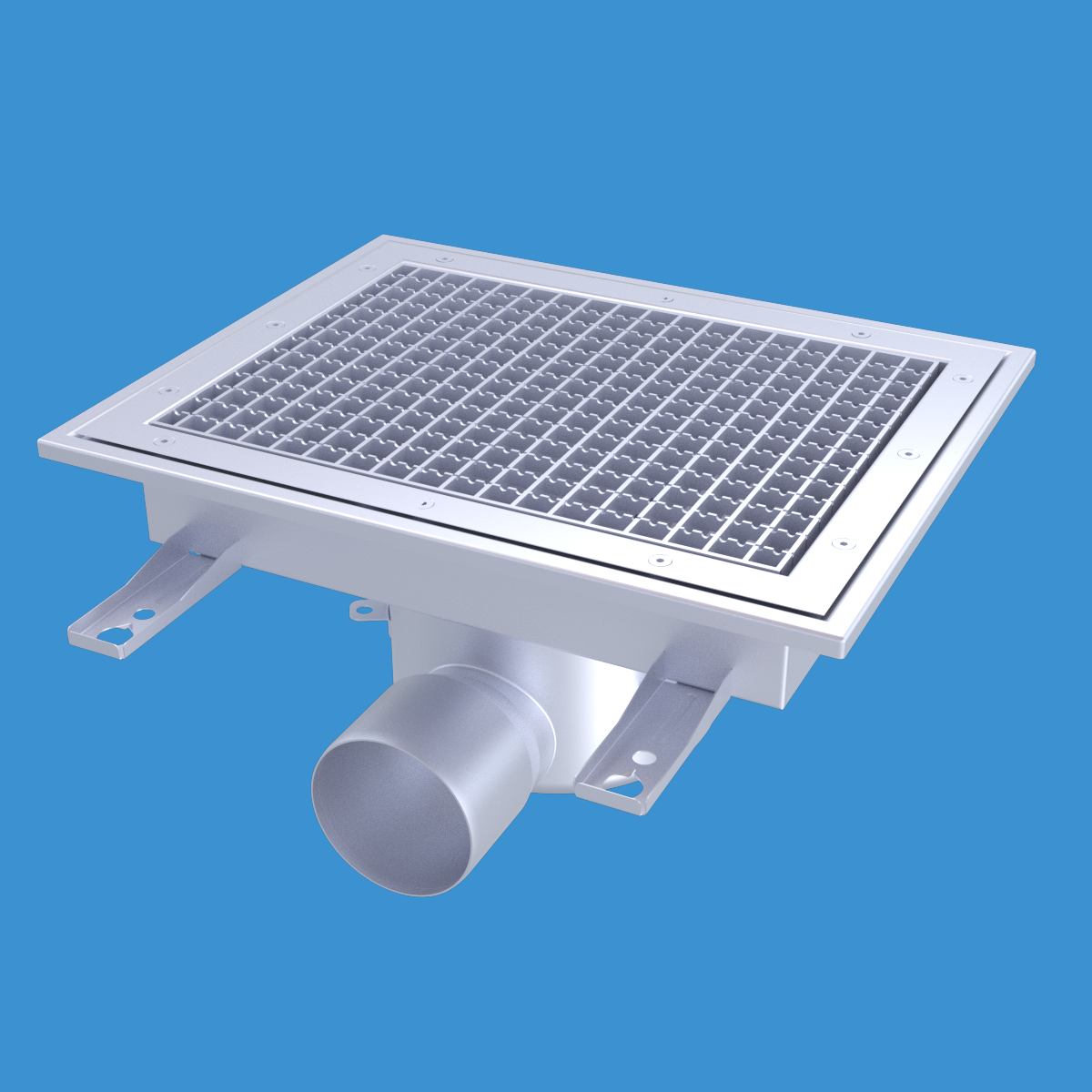 FURO 113 för bl.a. storkök och industri med lättare belastningar. Av syrafast rostfritt stål med sidoutlopp Ø110 mm, fyrkantöverdel med galler L15 dim. 400x300 mm. För golv med plastmatta. Komplettera ev. med silkorg 7120796.