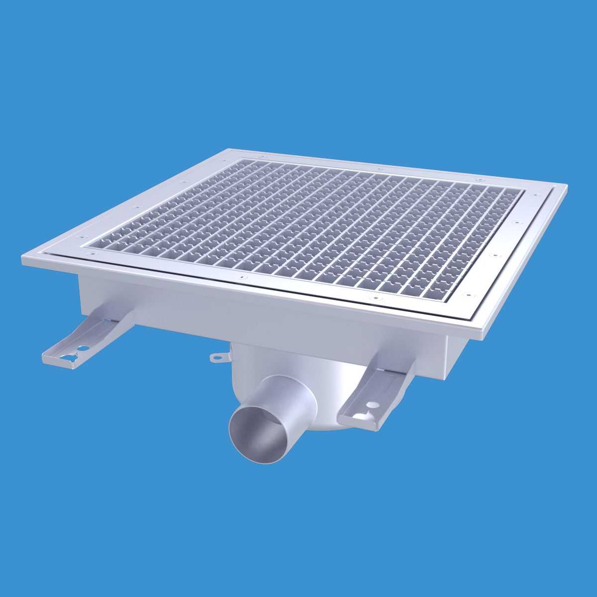 FURO 113 för bl.a. storkök och industri med lättare belastningar. Av syrafast rostfritt stål med sidoutlopp Ø75 mm, fyrkantöverdel med galler L15 dim. 400x400 mm. För golv med plastmatta. Komplettera ev. med silkorg 7120796.