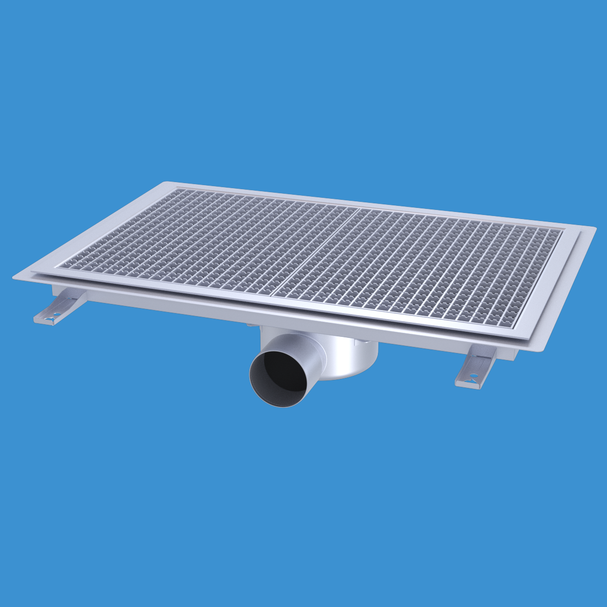 FURO 113 för bl.a. storkök och industri med lättare belastningar. Av syrafast rostfritt stål med sidoutlopp Ø110 mm, fyrkantöverdel med galler L15 dim. 800x500 mm. För Klinkergolv K4, tätskikt som klistras mot klisterfläns. Komplettera ev. med silkorg 7120796.