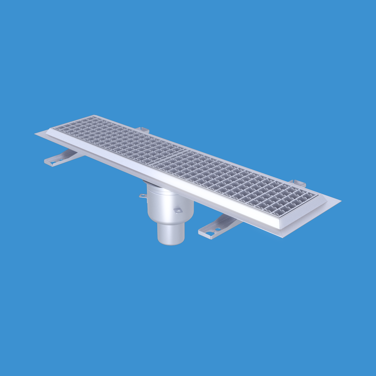 FURO 115 för bl.a. storkök och industri med lättare belastningar. Av syrafast rostfritt stål med bottenutlopp Ø75 mm, fyrkantöverdel med galler L15 dim. 800x150 mm. För massagolv. Komplettera ev. med silkorg 7119548.