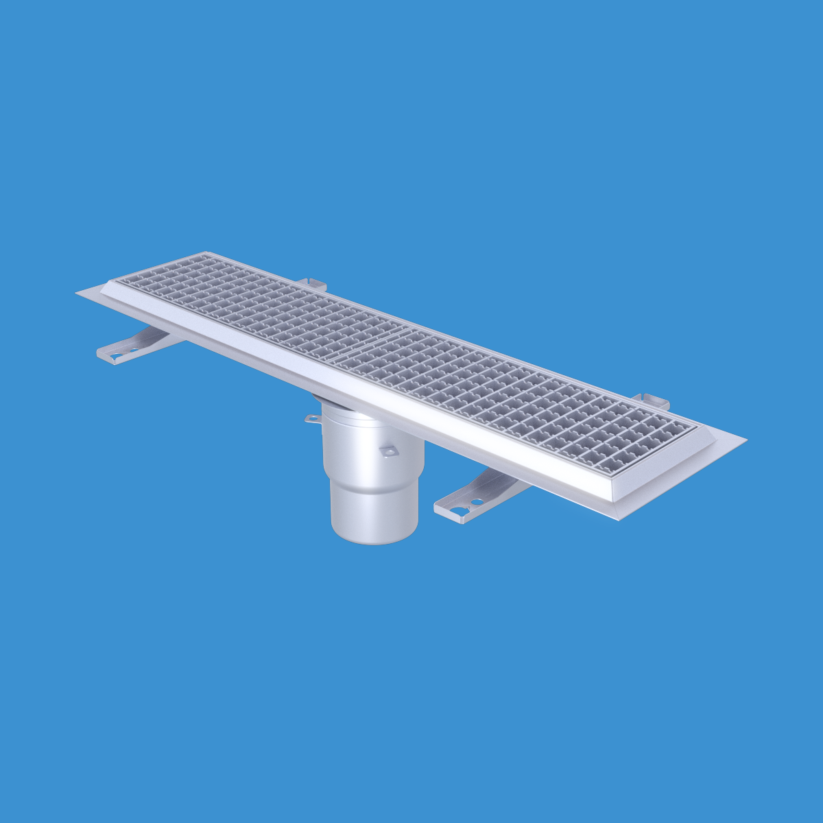 FURO 115 för bl.a. storkök och industri med lättare belastningar. Av syrafast rostfritt stål med bottenutlopp Ø110 mm, fyrkantöverdel med galler L15 dim. 800x150 mm. För massagolv. Komplettera ev. med silkorg 7119548.