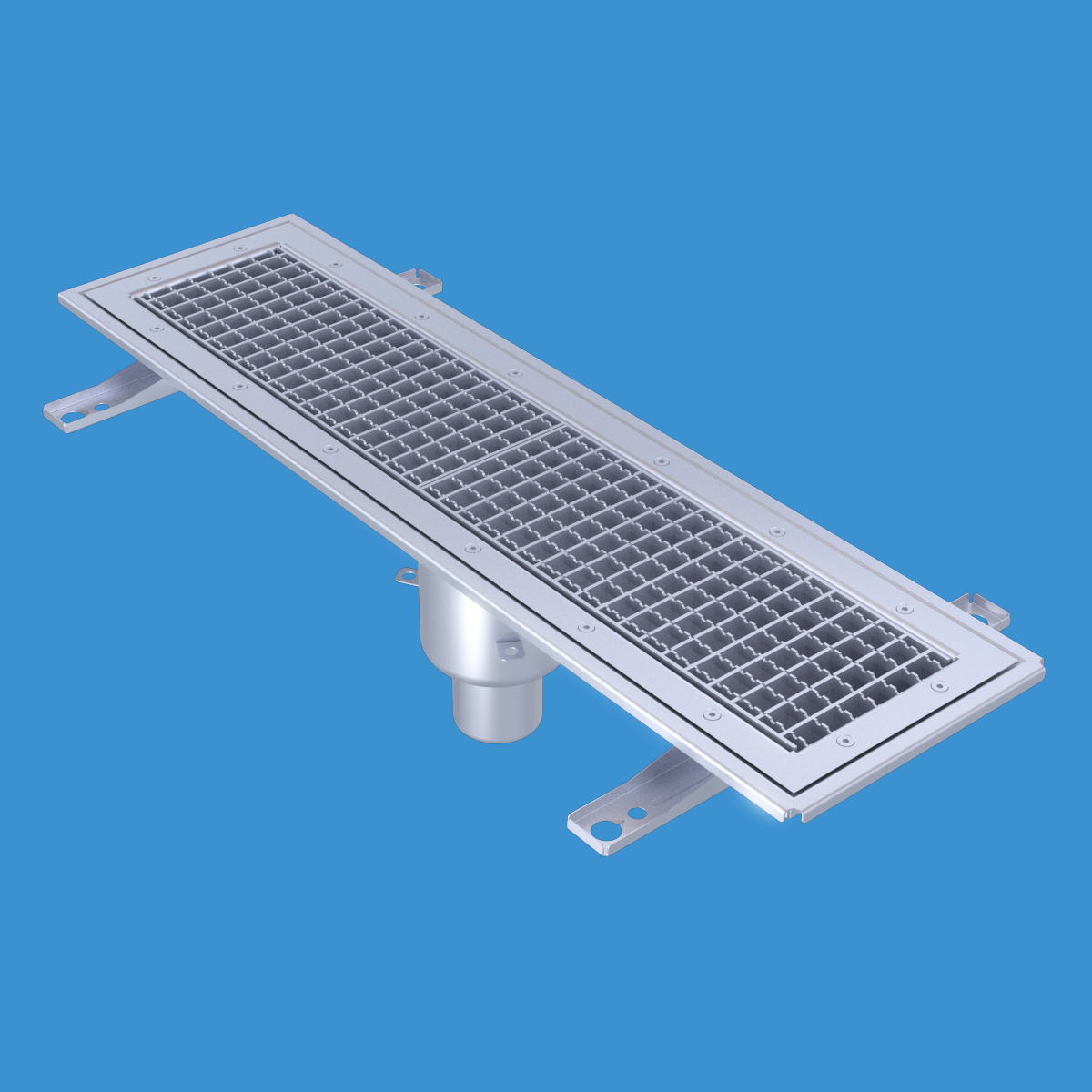 FURO 115 för bl.a. storkök och industri med lättare belastningar. Av syrafast rostfritt stål med bottenutlopp Ø75 mm, fyrkantöverdel med galler L15 dim. 800x150 mm. För golv med plastmatta. Komplettera ev. med silkorg 7119548.