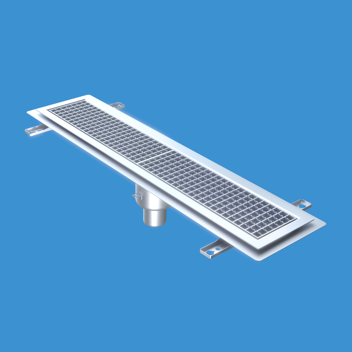 FURO 115 för bl.a. storkök och industri med lättare belastningar. Av syrafast rostfritt stål med bottenutlopp Ø75 mm, fyrkantöverdel med galler L15 dim. 1000x150 mm. För Klinkergolv K4, tätskikt som klistras mot klisterfläns. Komplettera ev. med silkorg 7119548.