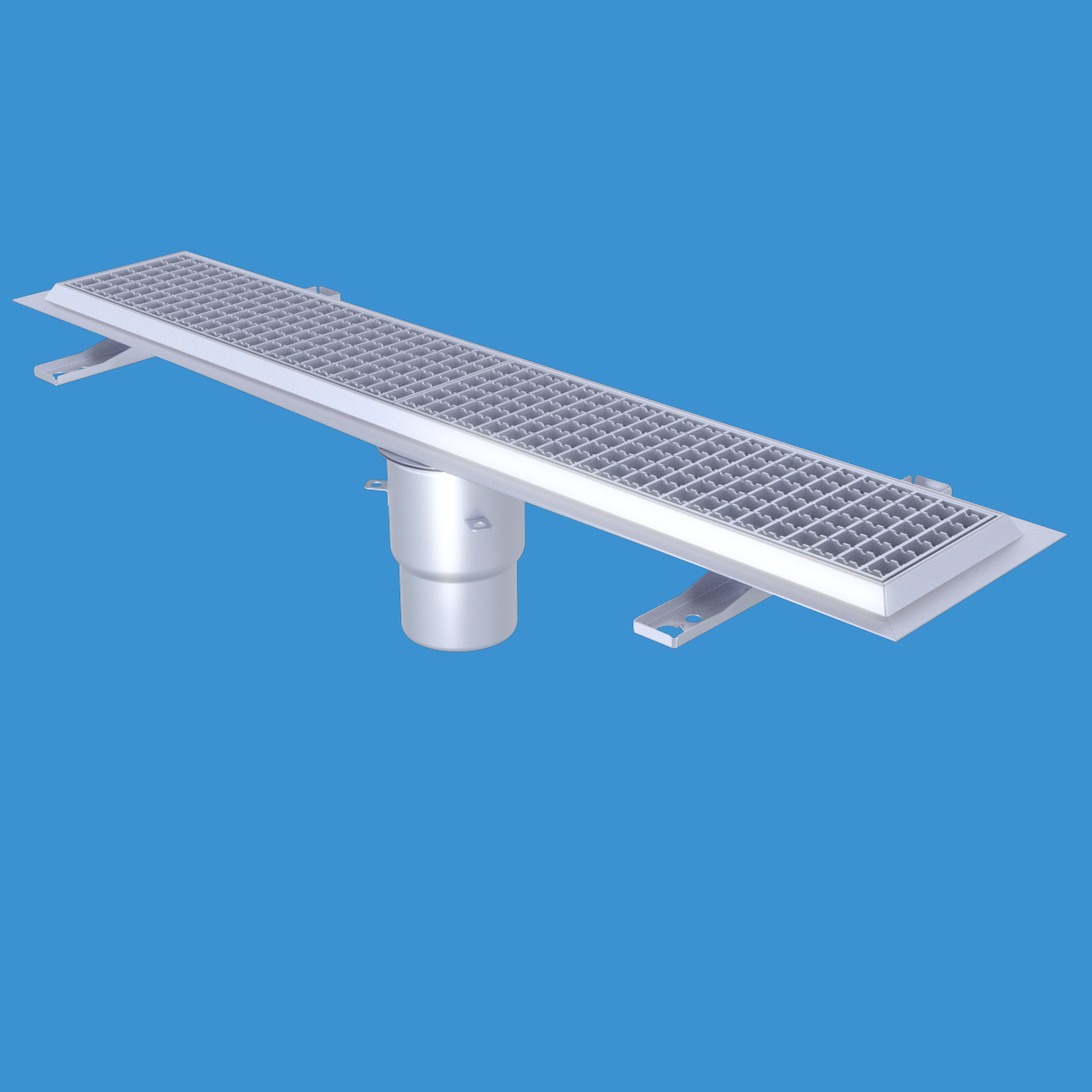 FURO 115 för bl.a. storkök och industri med lättare belastningar. Av syrafast rostfritt stål med bottenutlopp Ø110 mm, fyrkantöverdel med galler L15 dim. 1000x150 mm. För massagolv. Komplettera ev. med silkorg 7119548.