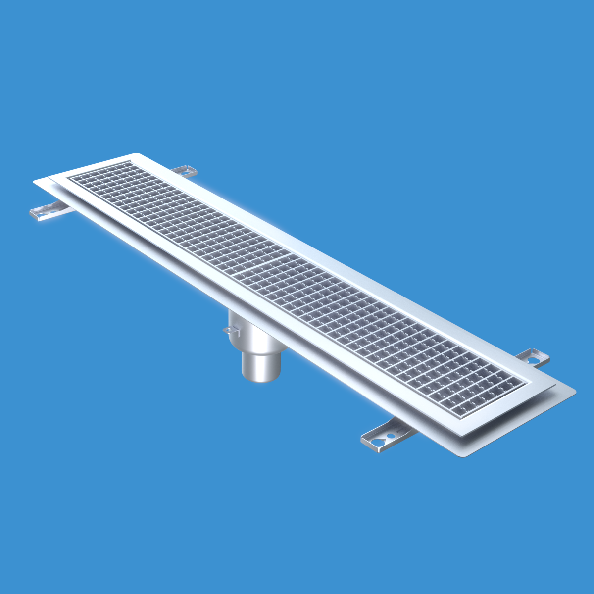 FURO 115 för bl.a. storkök och industri med lättare belastningar. Av syrafast rostfritt stål med bottenutlopp Ø75 mm, fyrkantöverdel med galler L15 dim. 1100x150 mm. För Klinkergolv K4, tätskikt som klistras mot klisterfläns. Komplettera ev. med silkorg 7119548.