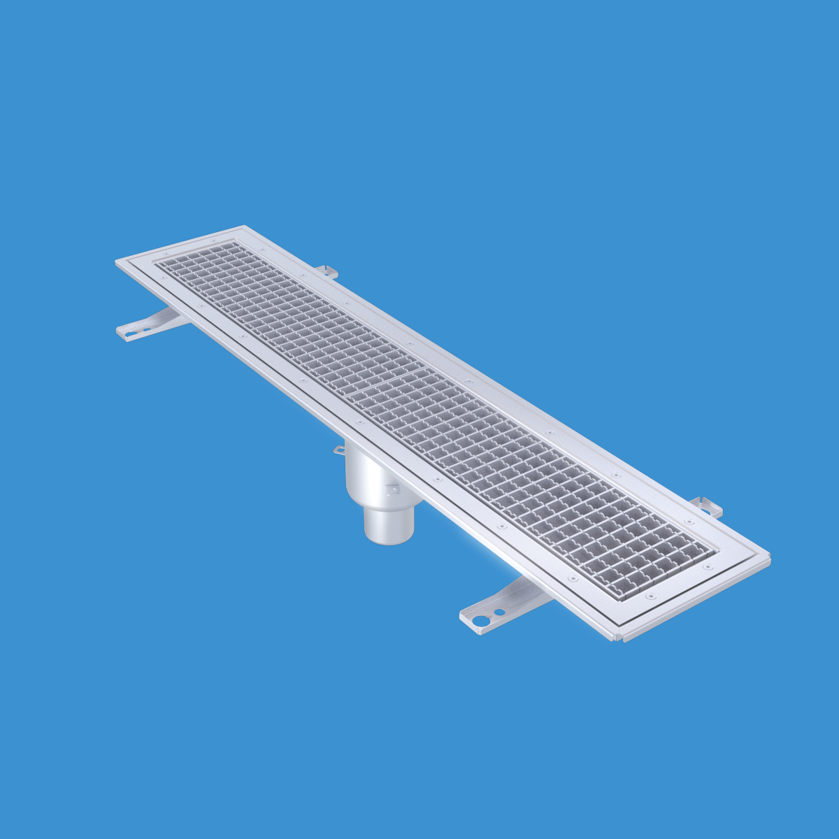 FURO 115 för bl.a. storkök och industri med lättare belastningar. Av syrafast rostfritt stål med bottenutlopp Ø75 mm, fyrkantöverdel med galler L15 dim. 1100x150 mm. För golv med plastmatta. Komplettera ev. med silkorg 7119548.